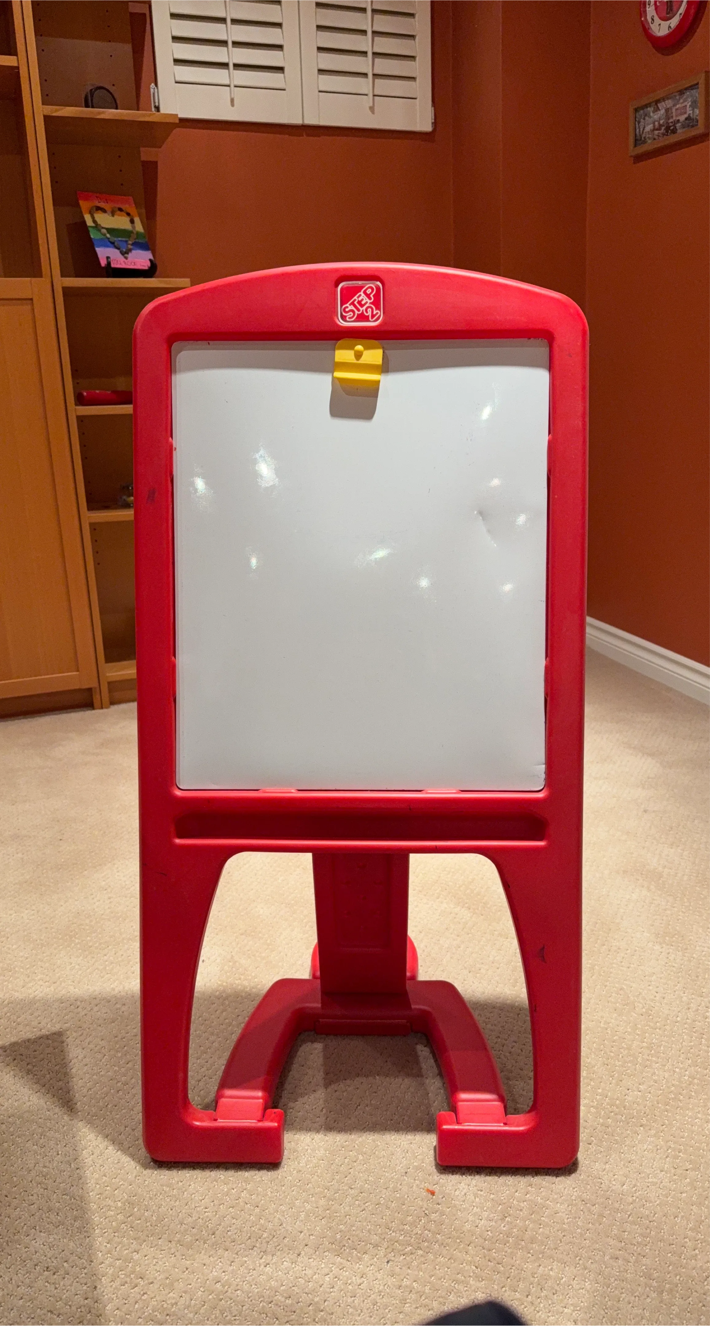 This red Little Tikes easel has a double-sided dry-erase board. It's perfect for kids to draw and create on. The sturdy base makes it great for active little artists. Built to last for hours of fun! Please note that there are no markers included with this item.