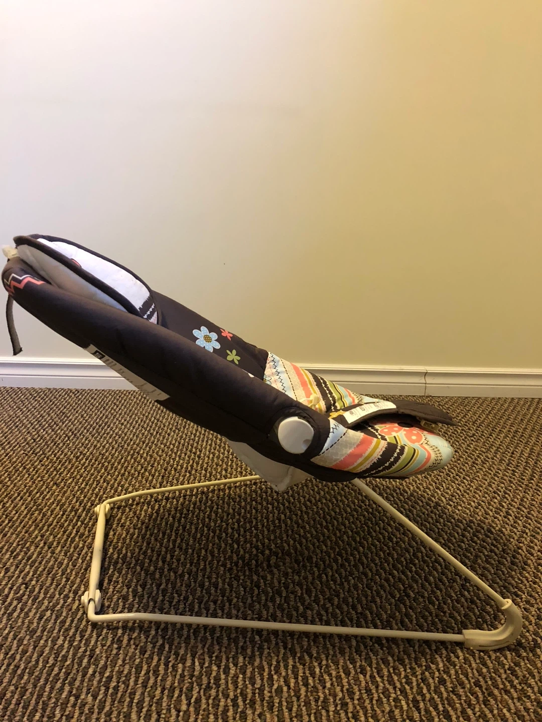 This baby bouncer seat has a comfortable padded seat with a colourful floral design. It's suitable for infants and toddlers. The frame is made of sturdy metal for stability.