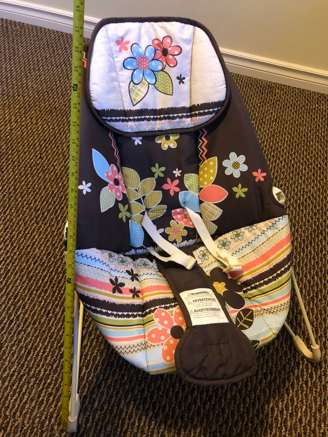 This baby bouncer seat has a comfortable padded seat with a colourful floral design. It's suitable for infants and toddlers. The frame is made of sturdy metal for stability.