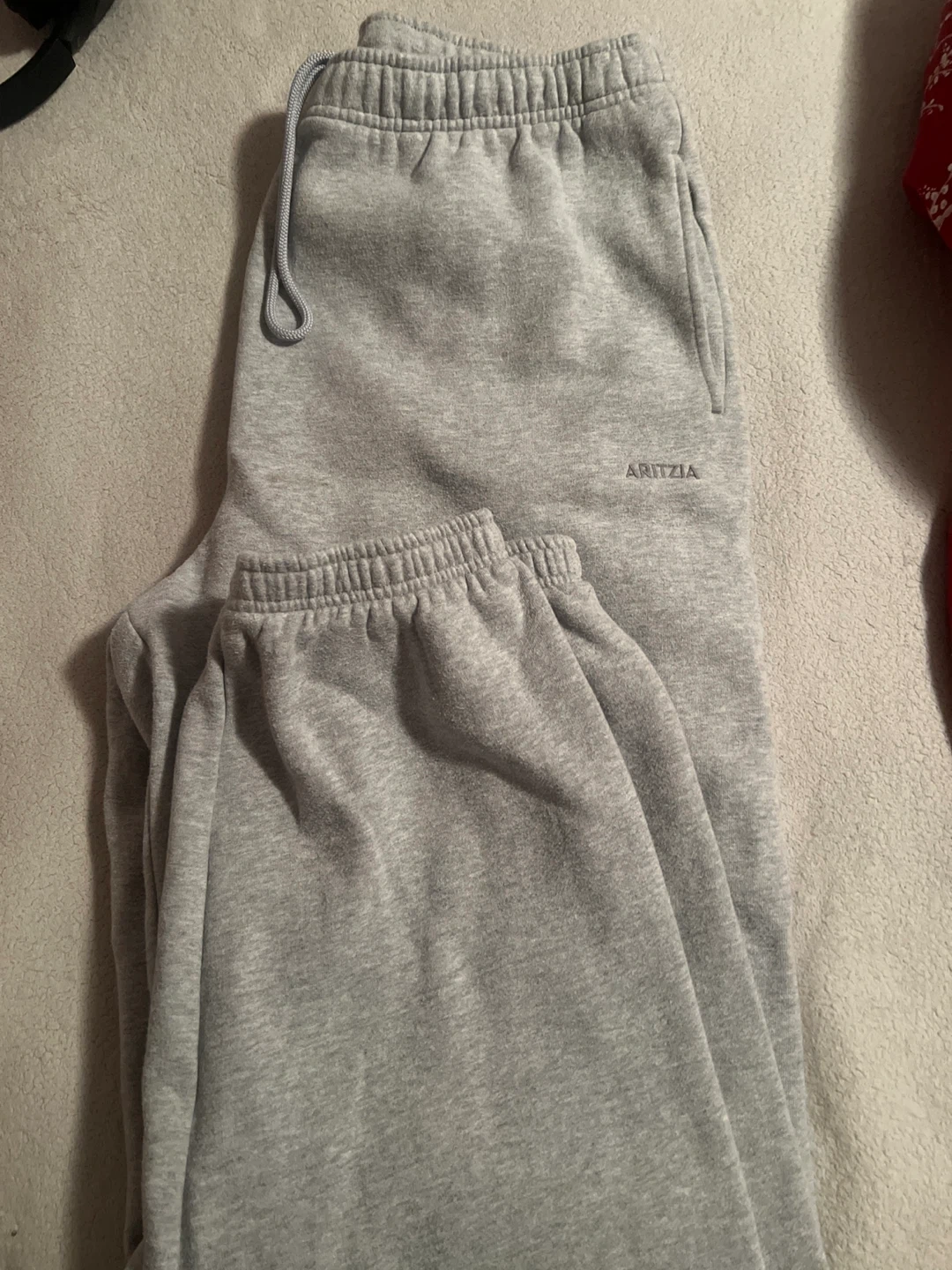 Aritzia Sweatfleece Cozy Fleece sweatpants in grey. Mega fit with cozy fleece lining. Made in Cambodia. Elastic waistband with drawstring.