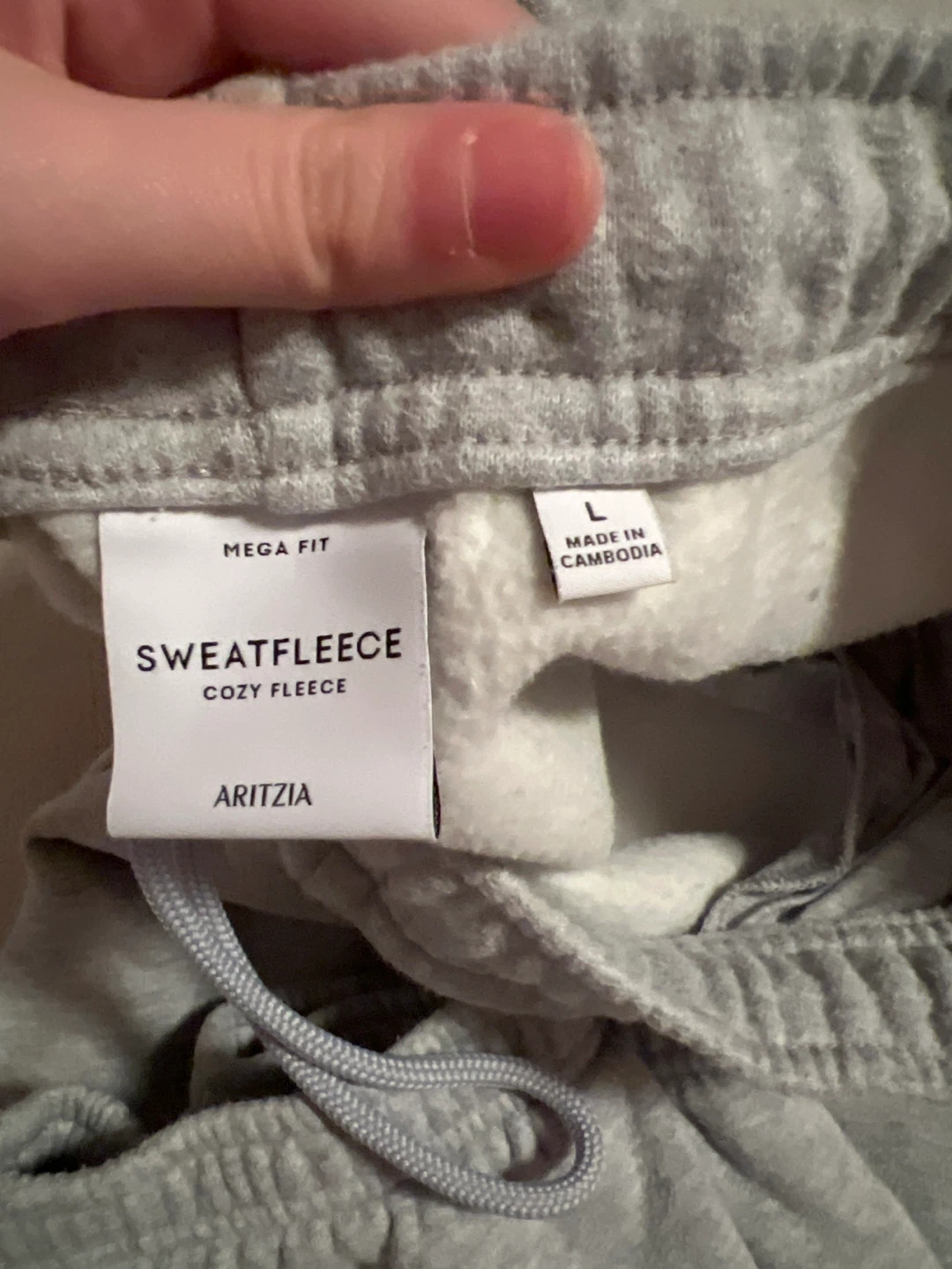 Aritzia Sweatfleece Cozy Fleece sweatpants in grey. Mega fit with cozy fleece lining. Made in Cambodia. Elastic waistband with drawstring.