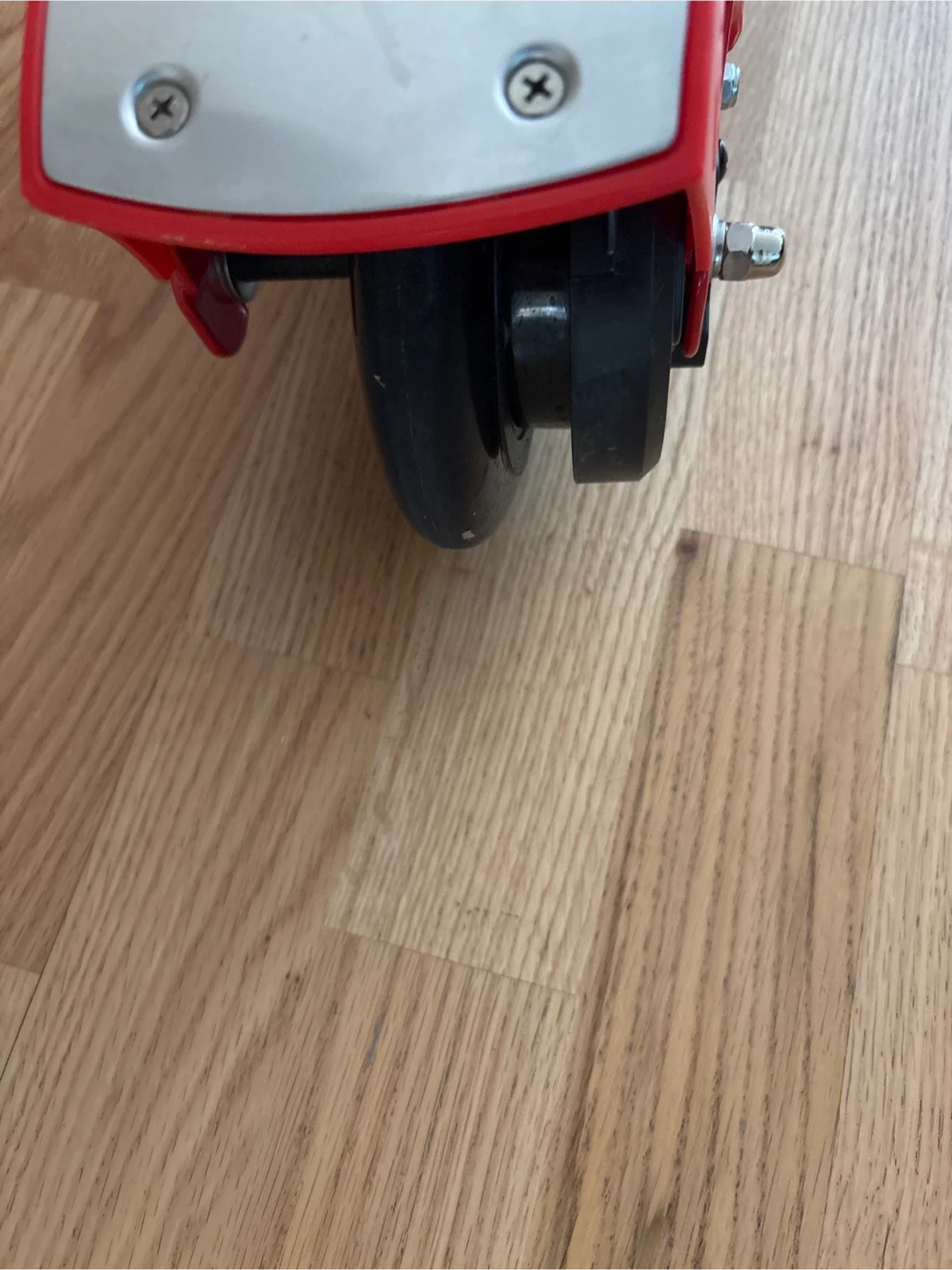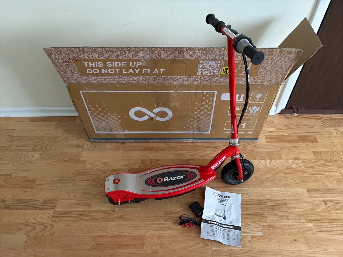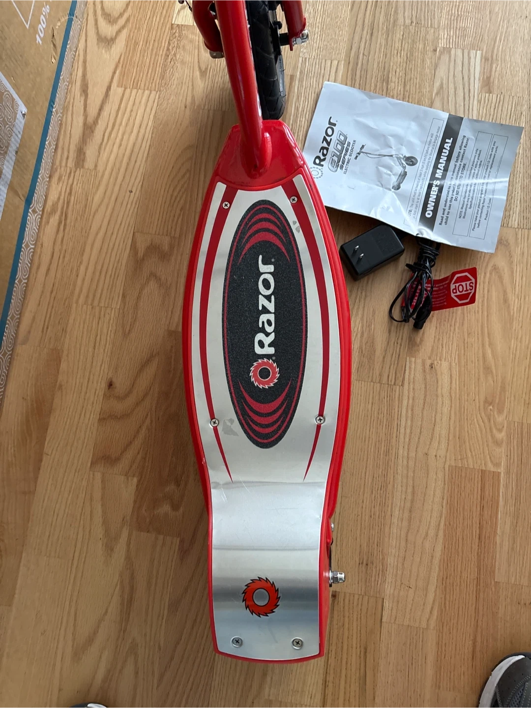 This red Razor E200 electric scooter is in good condition. It includes the charger and owner's manual. It's ready for some fun rides!