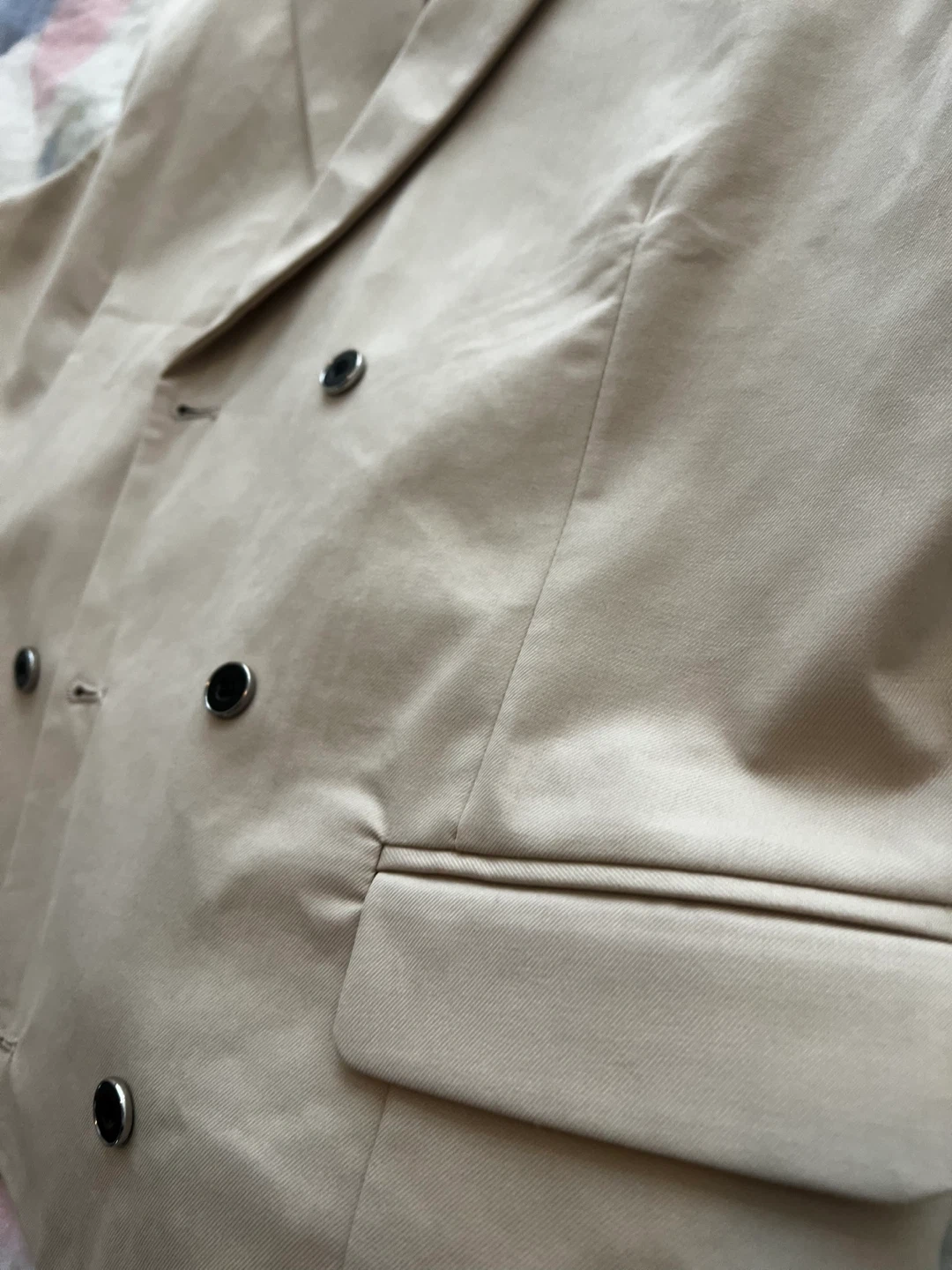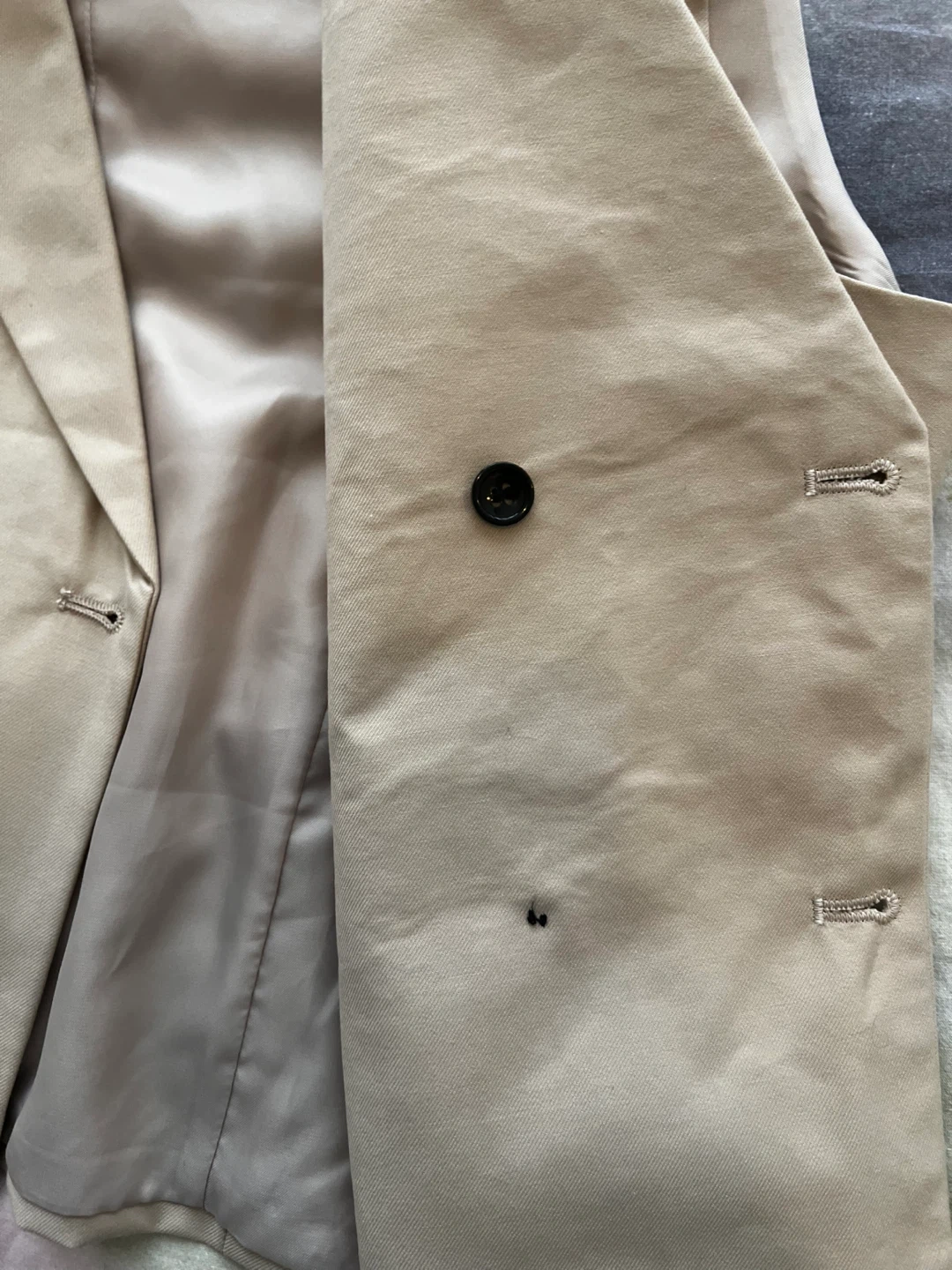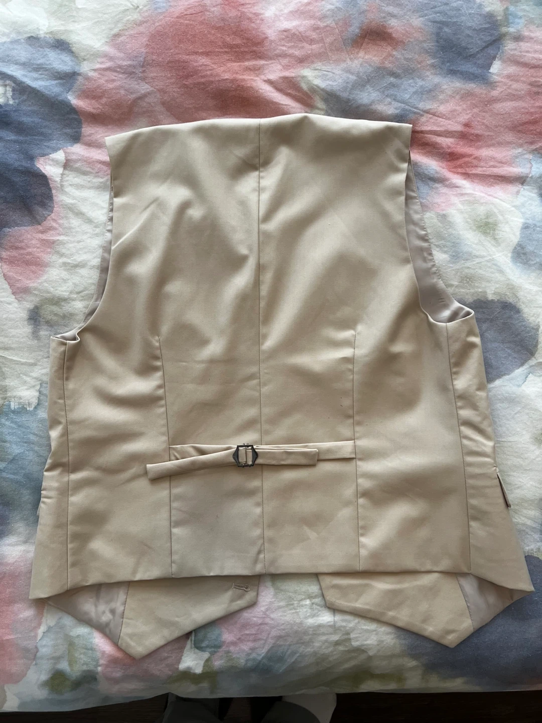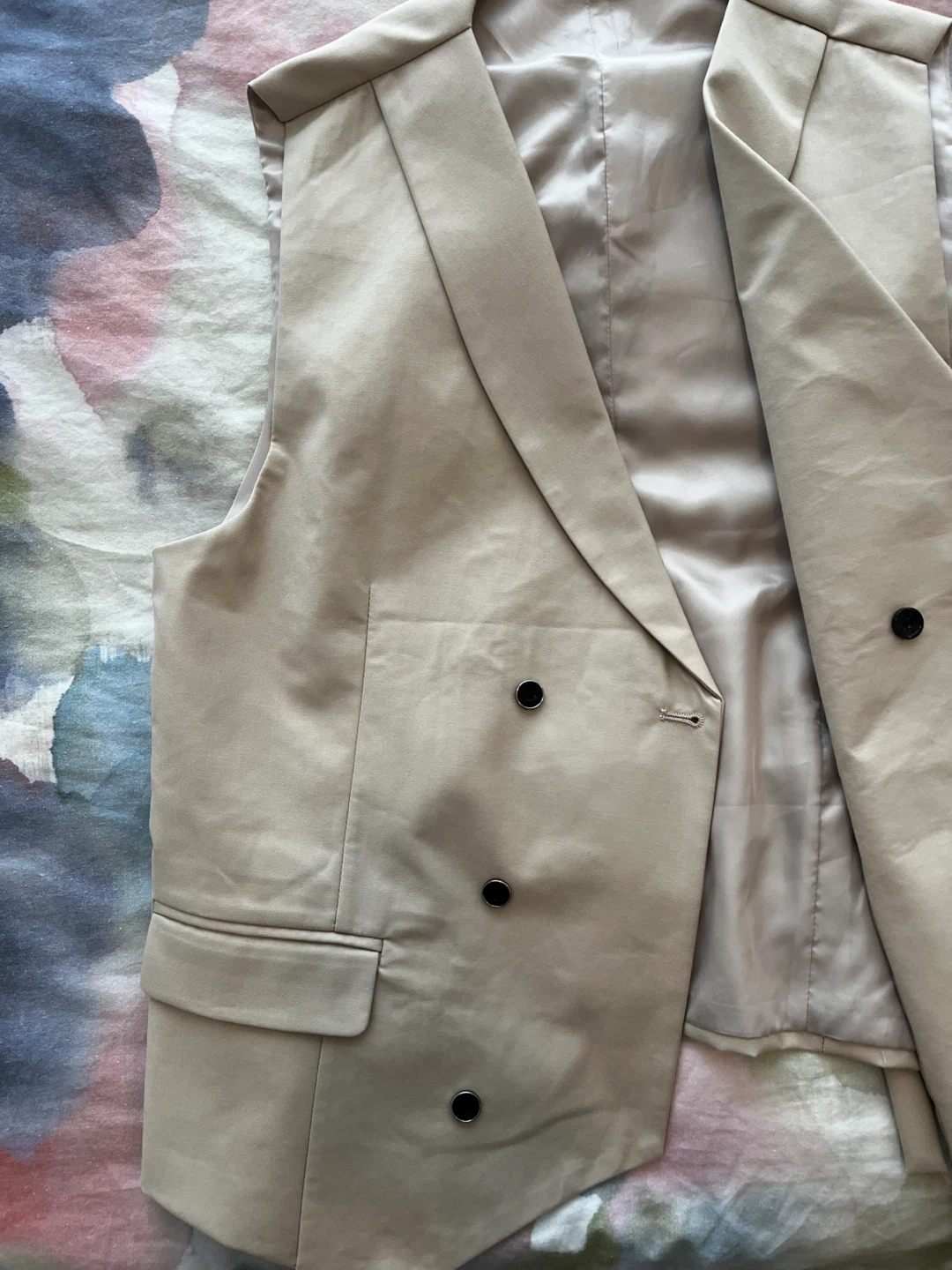This tan vest features a double-breasted front with black buttons. It has a satin lining and two front pockets. Great for layering your outfit!