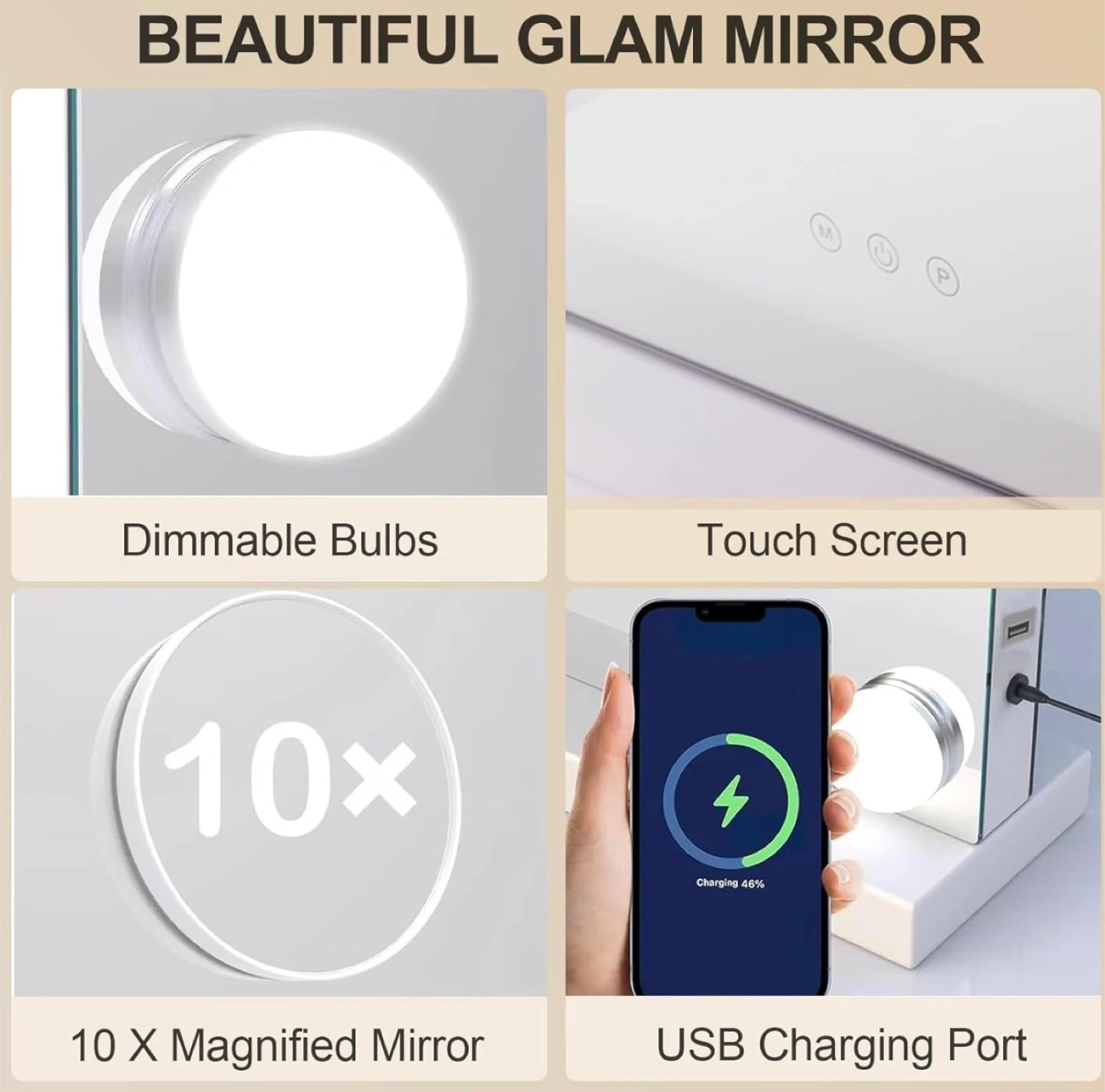 This beautiful glam mirror features dimmable bulbs and touch controls. It includes a 10x magnified mirror and a USB charging port. The mirror offers three colour light settings.
