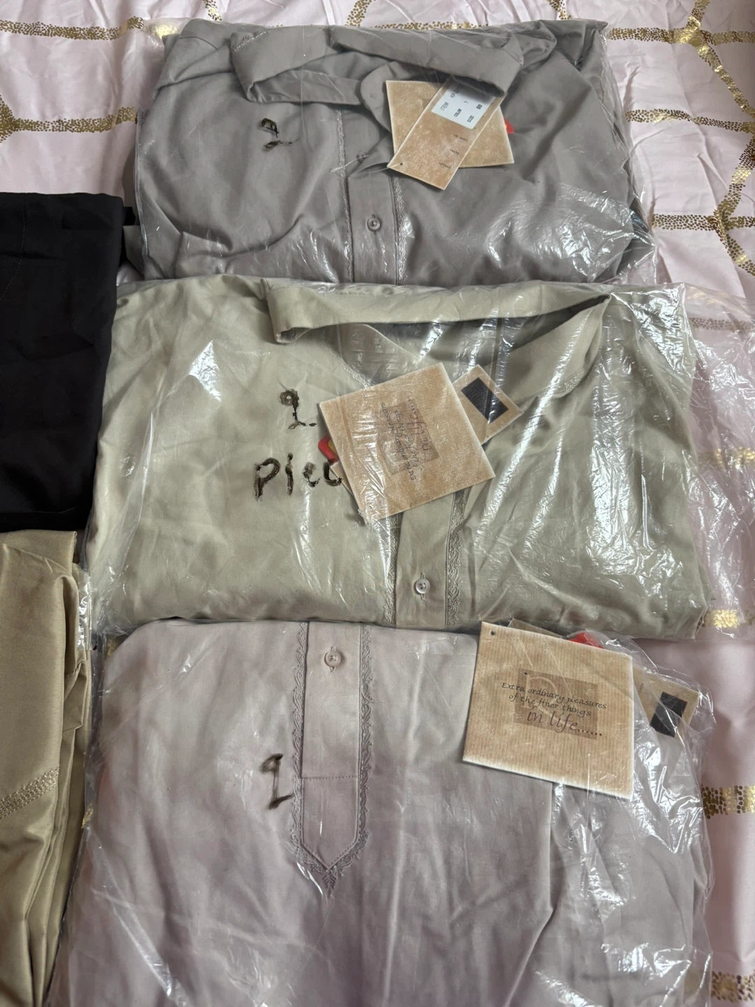 A set of six men's shalwar kameez outfits in various colours. Includes black, light beige, grey, and beige. Each outfit is made of a lightweight fabric and comes with a kameez and shalwar. Perfect for daily wear or special occasions!