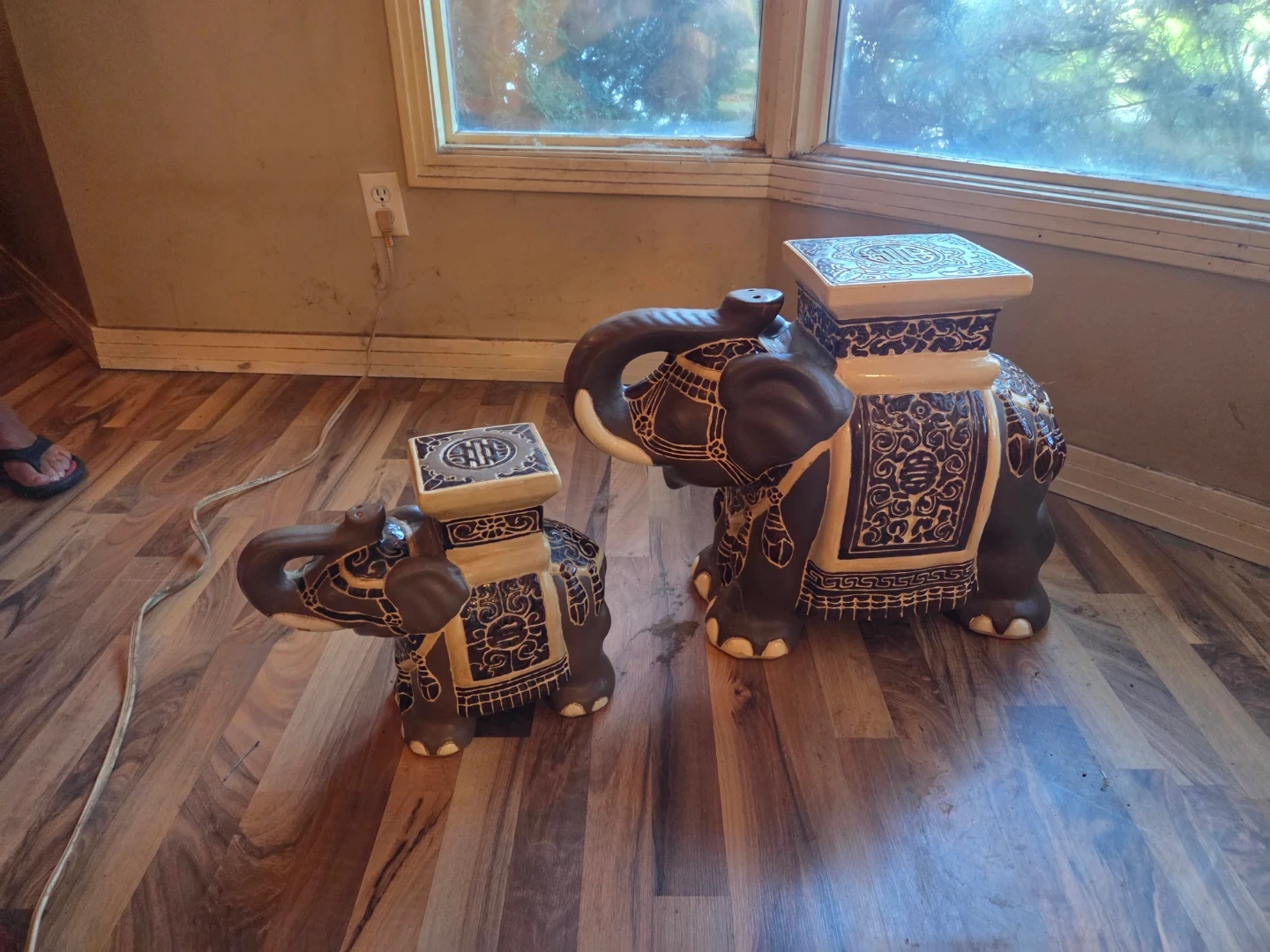 A pair of decorative elephant plant stands. Features intricate detailing and a glossy finish. Great for adding a touch of whimsy to your home!