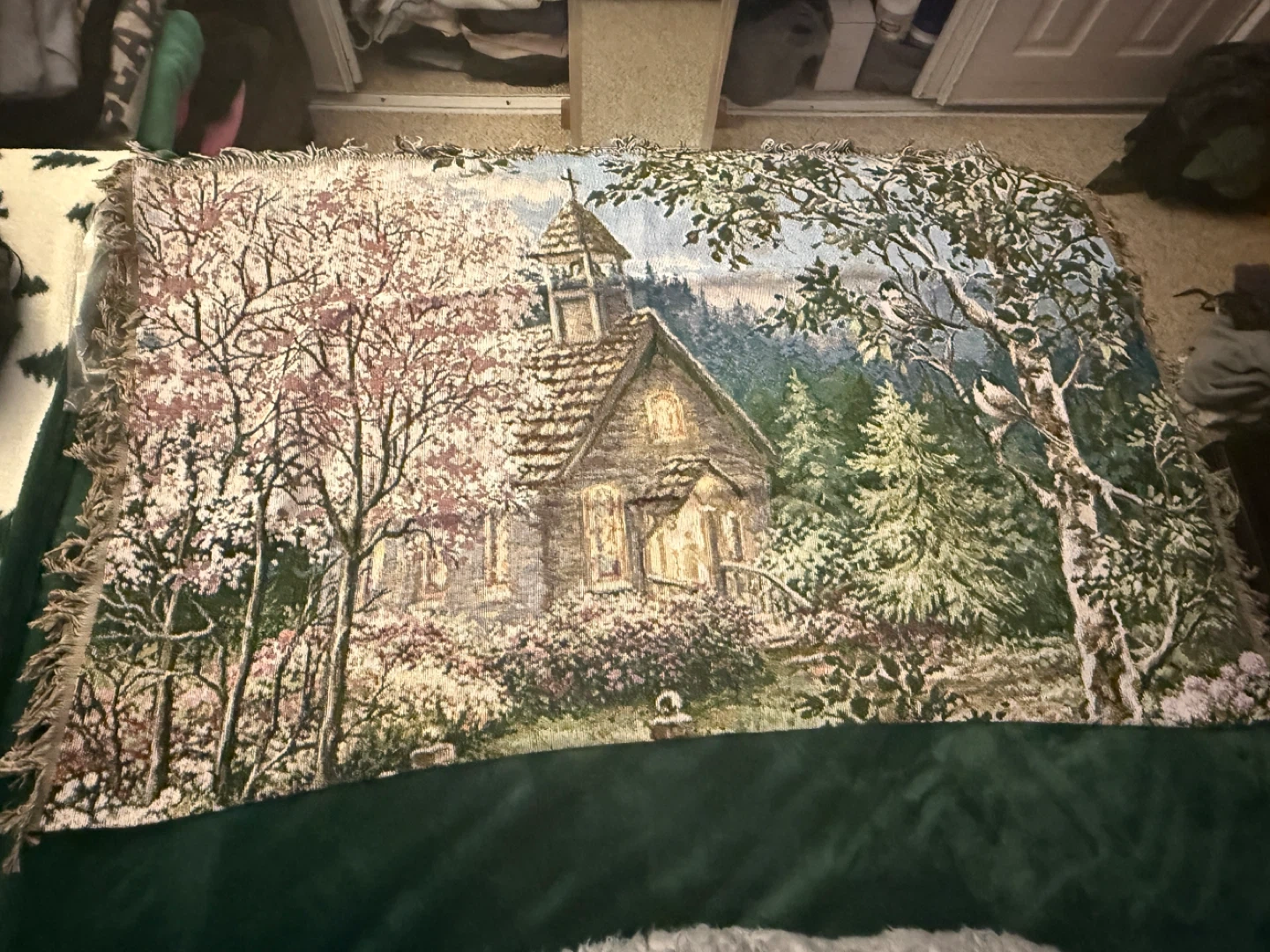 This woven throw blanket features a beautiful chapel scene with the "Amazing Grace" hymn lyrics. It's made in China and includes fringe detailing. It's perfect for adding a touch of serenity to your home decor.