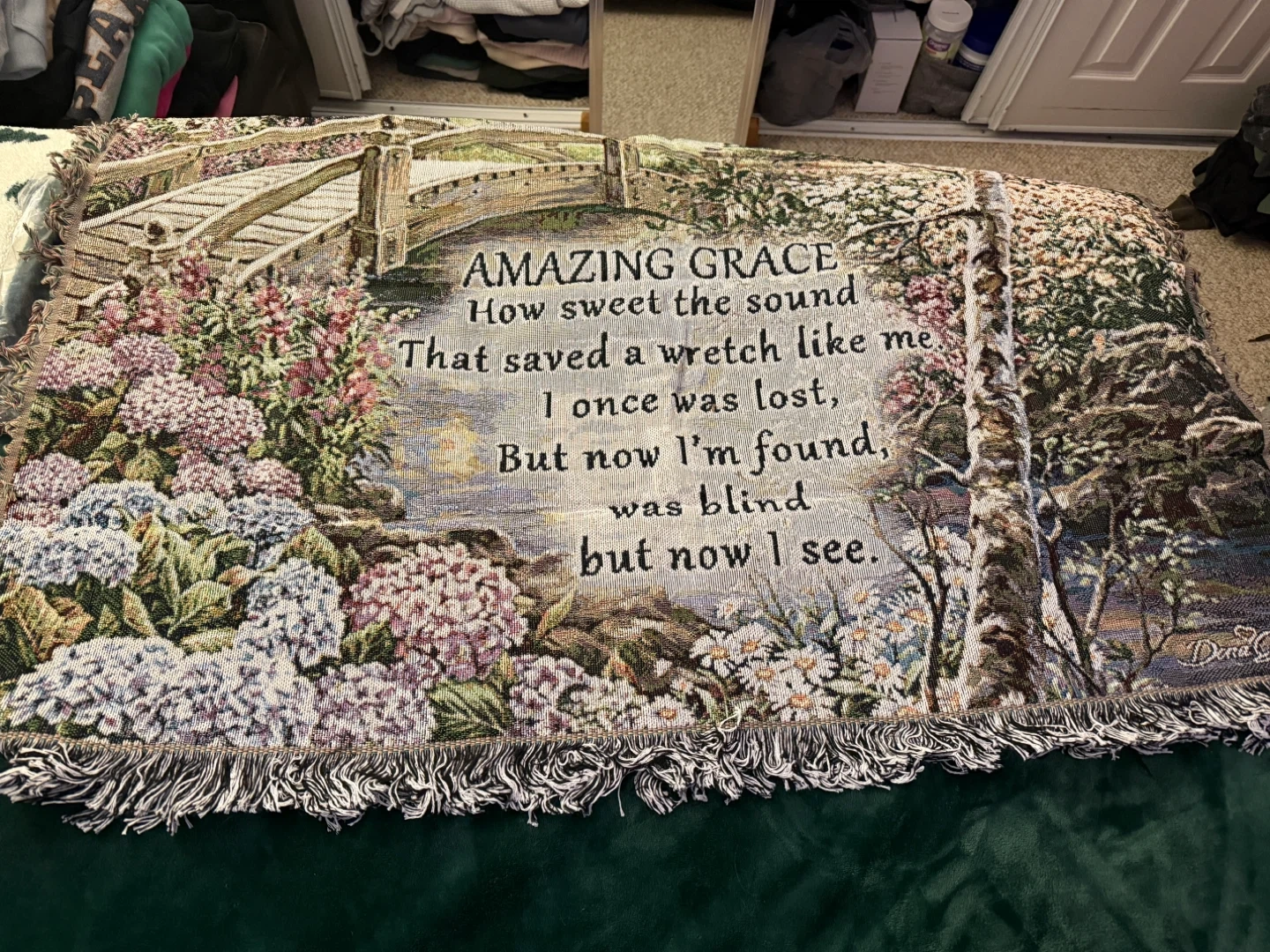 This woven throw blanket features a beautiful chapel scene with the "Amazing Grace" hymn lyrics. It's made in China and includes fringe detailing. It's perfect for adding a touch of serenity to your home decor.