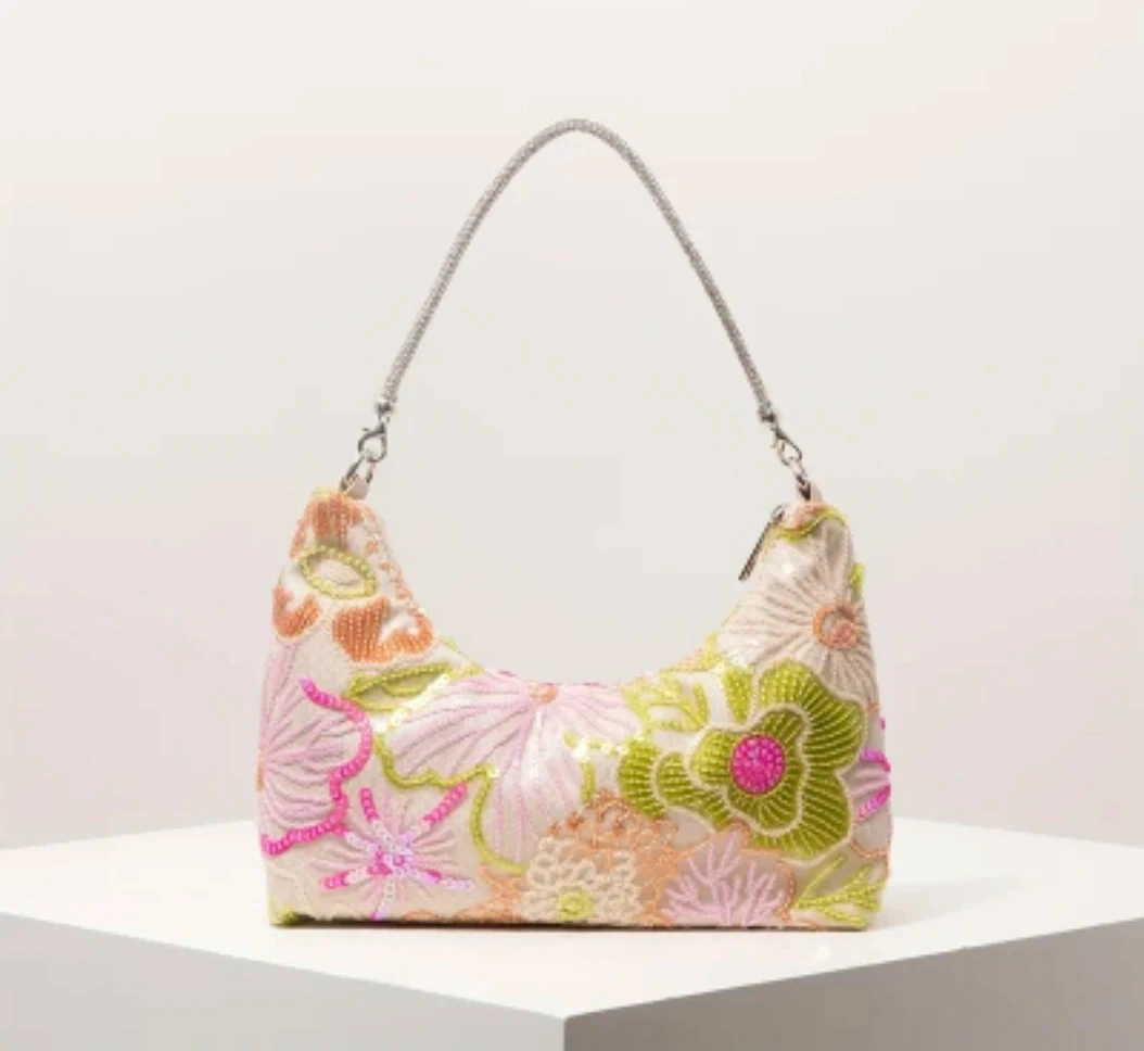 Make a sparkling statement with these exquisite floral hobo-style handbags. Each piece is intricately detailed with shimmering sequins and delicate beadwork, creating a textured 3D floral landscape that catches the light beautifully.
