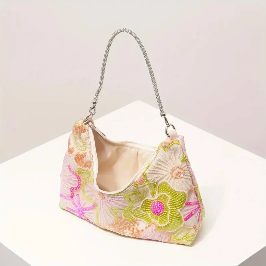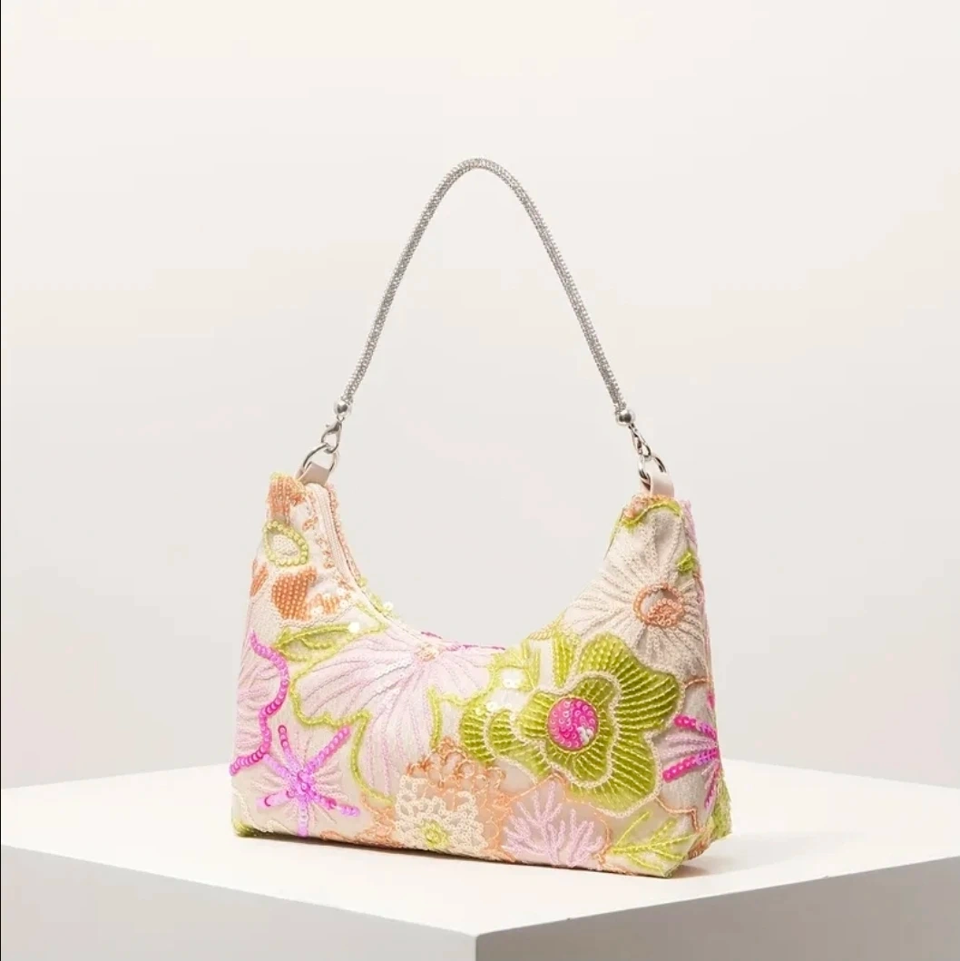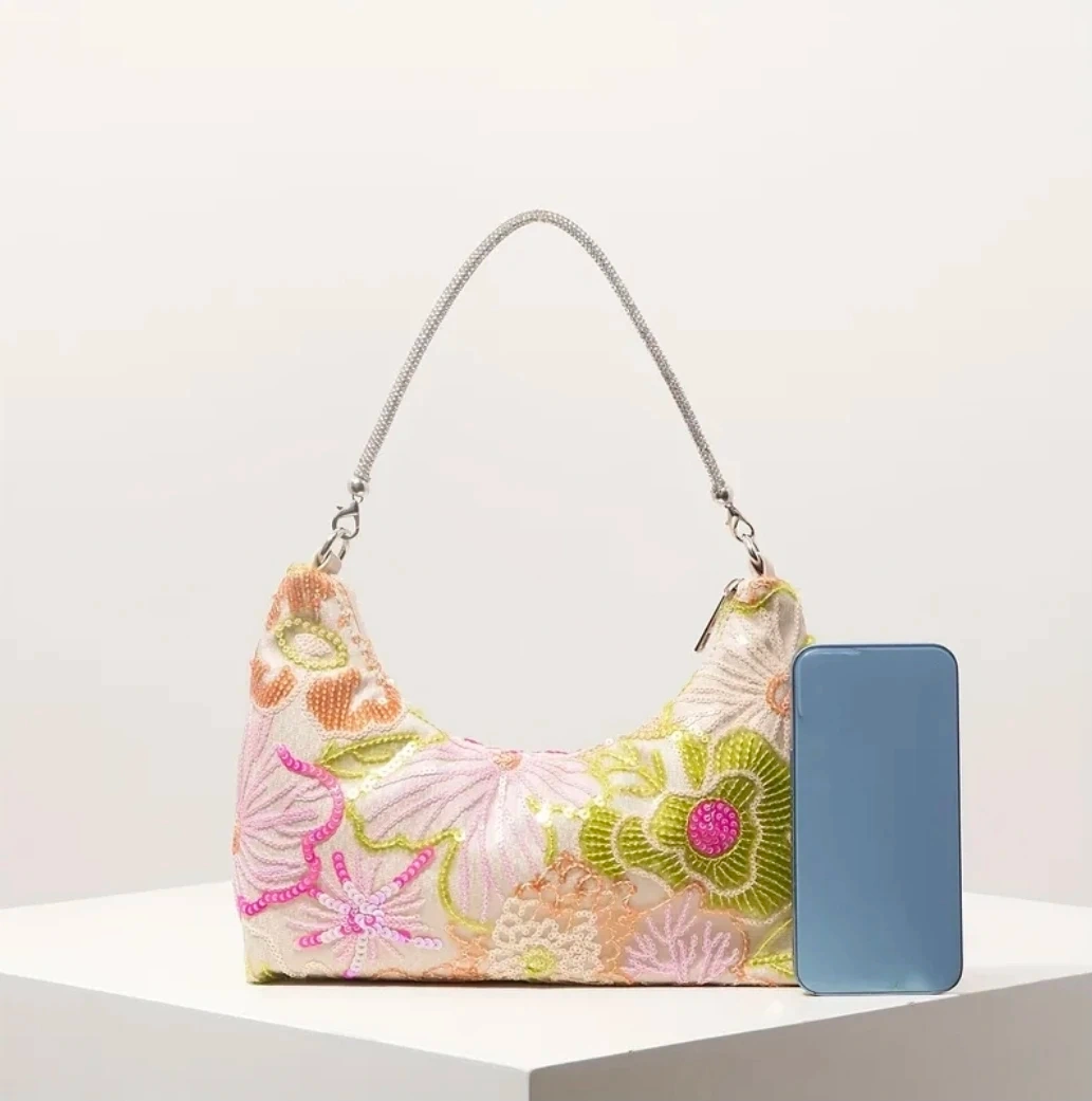 Floral Sequin Embroidered Hand Bags removable diamond strap