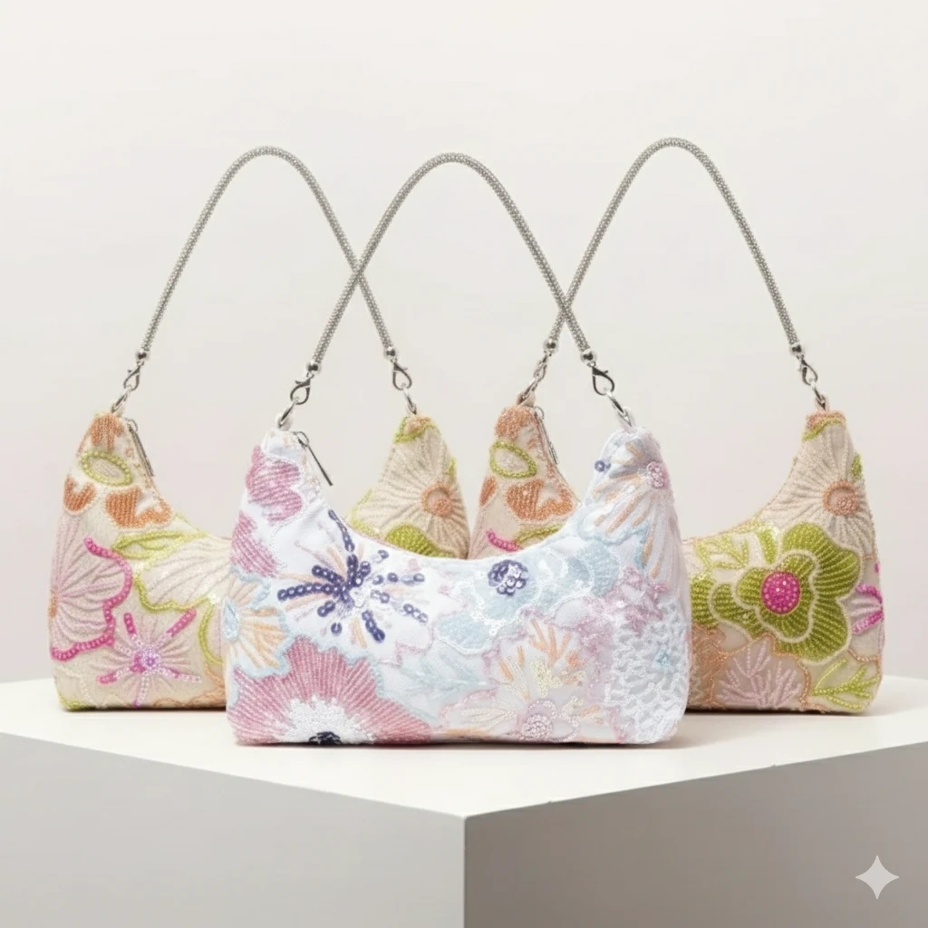 Make a sparkling statement with these exquisite floral hobo-style handbags. Each piece is intricately detailed with shimmering sequins and delicate beadwork, creating a textured 3D floral landscape that catches the light beautifully.
