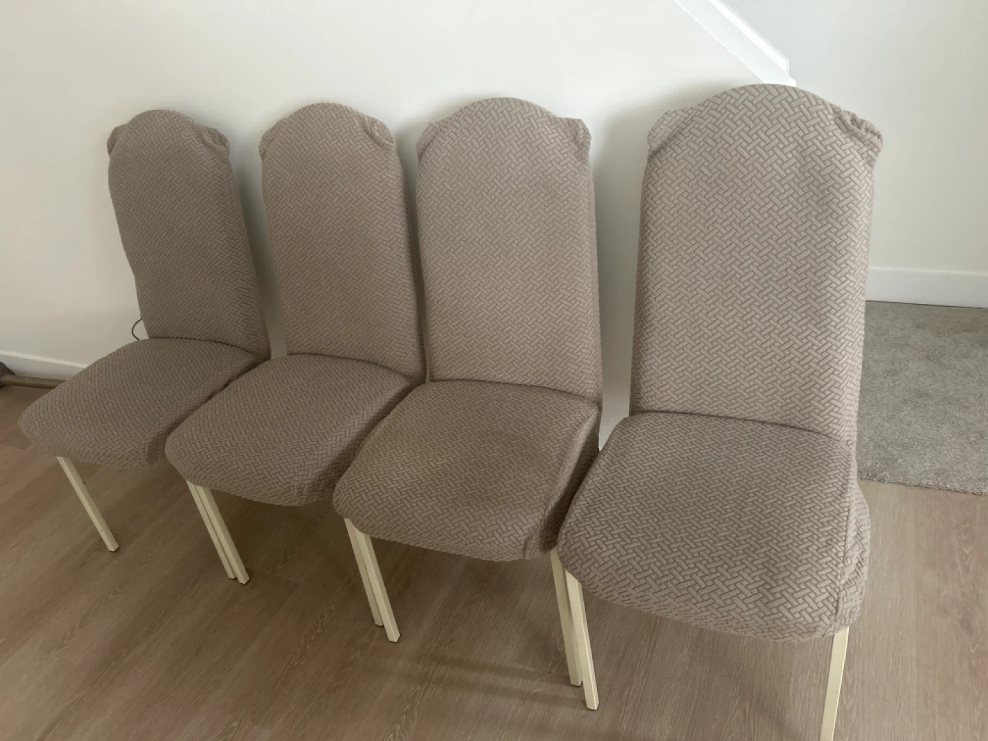 Set of four upholstered dining chairs with a subtle geometric pattern. The chairs have light-coloured metal legs and a neutral beige fabric. They're ready to add a touch of comfort to your dining space!