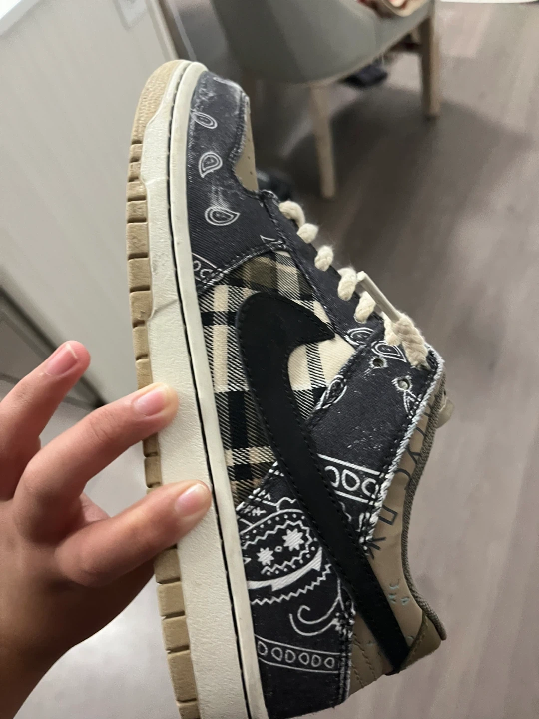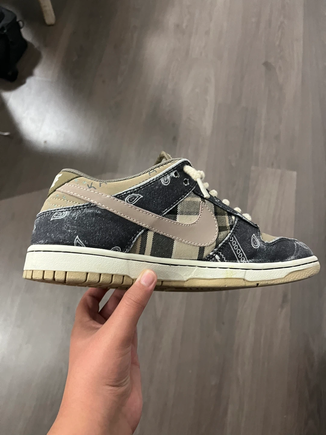 These Nike SB Dunk Low sneakers feature a unique patchwork design with bandana and plaid patterns. They have a distinctive lace-up closure and the iconic Nike Swoosh. The insoles clearly show the Nike SB branding.
