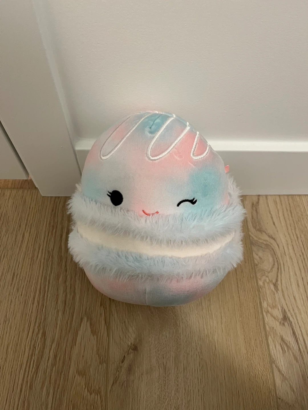 It's a soft Squishmallows plush toy shaped like a pastel-coloured macaron. It has a fluffy outer layer and embroidered facial features, with one eye winking. This adorable plush is great for cuddles!