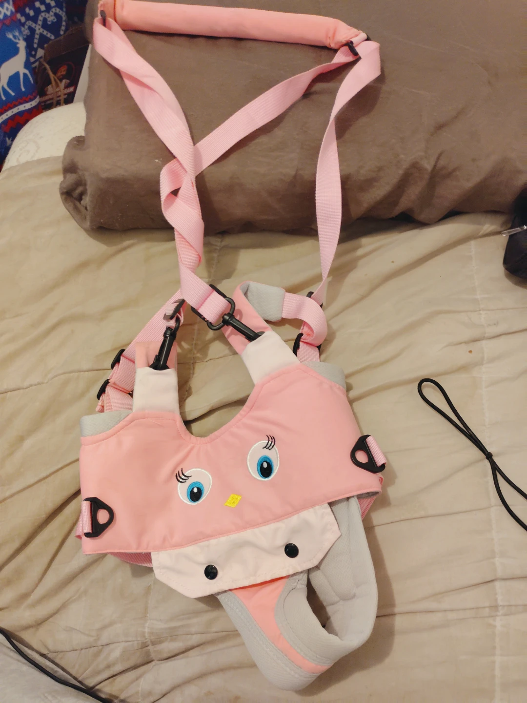 This pink walking harness is designed to help your little one learn to walk. It's adjustable for a comfortable fit. The harness is made from soft, durable fabric. Helps support your child's balance development!