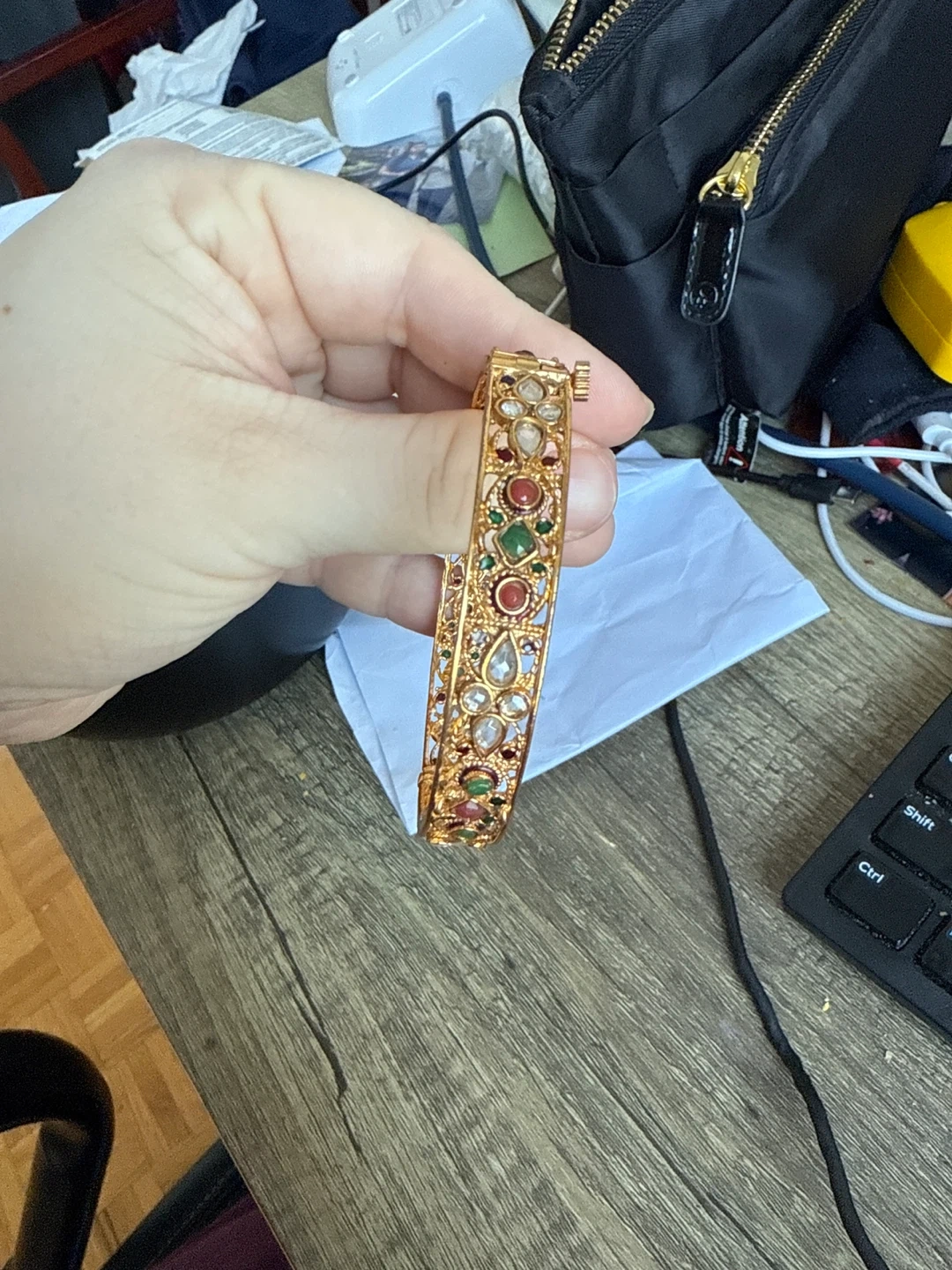 Beautiful gold-tone hinged bangle bracelet adorned with colourful stones like red, green, and clear gems. It's a statement piece that adds sparkle to any outfit. This bracelet is likely made of metal with inlaid stones. It is a screw open so can fit anyone