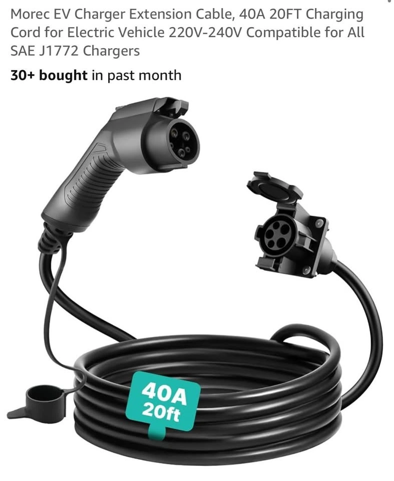 Selling a Morec 40A 20FT EV Charger Extension Cable, compatible with all SAE J1772 chargers. Perfect for electric cars at home, office, or public charging stations.