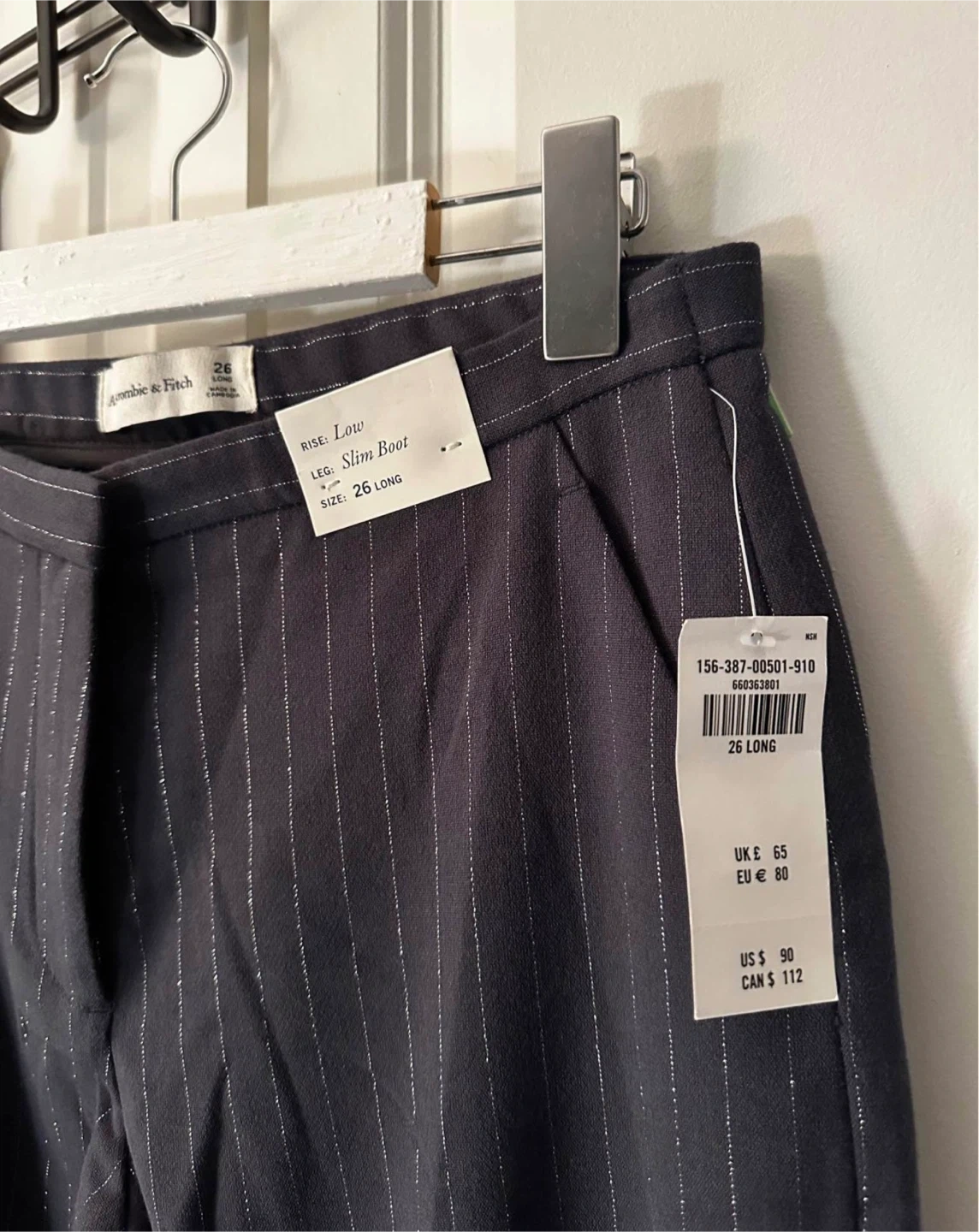 Selling a pair of Abercrombie & Fitch pinstripe slim boot pants in size 26 Long. They are in great condition and ready for a new wardrobe! Retails for $112+ tax