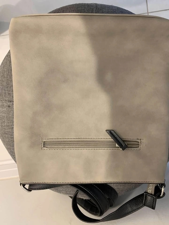 Gently used beige leather bag with black straps and silver hardware. Has a zipper pocket on the front and a metal plate with brand name. Some discoloration on front and back.