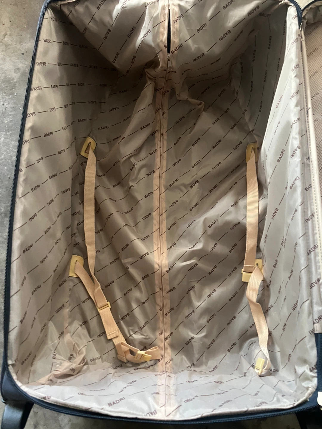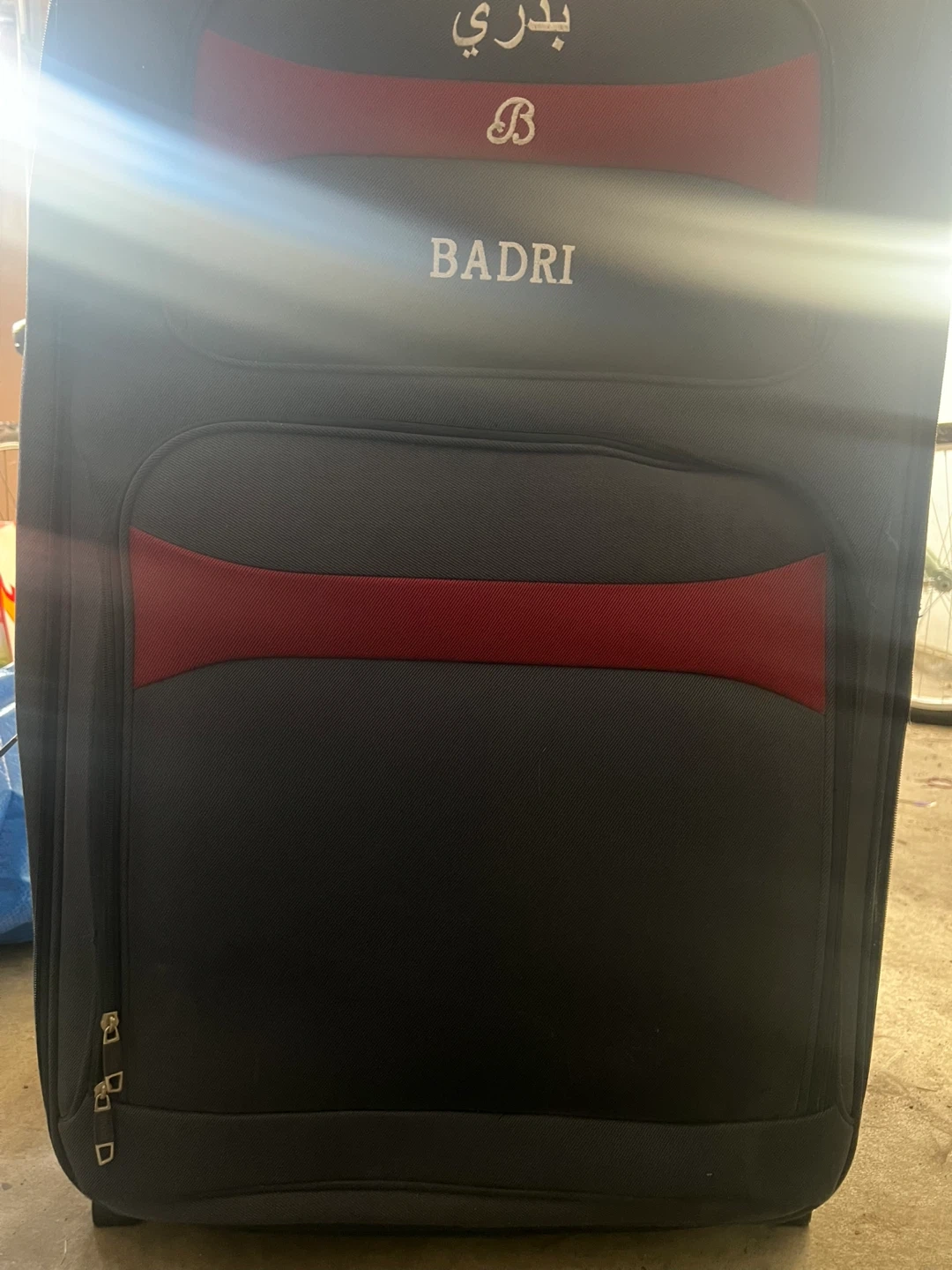 This is a Badri brand suitcase. It's black with red accents. The interior lining has the Badri logo repeated throughout. Good for your next trip!