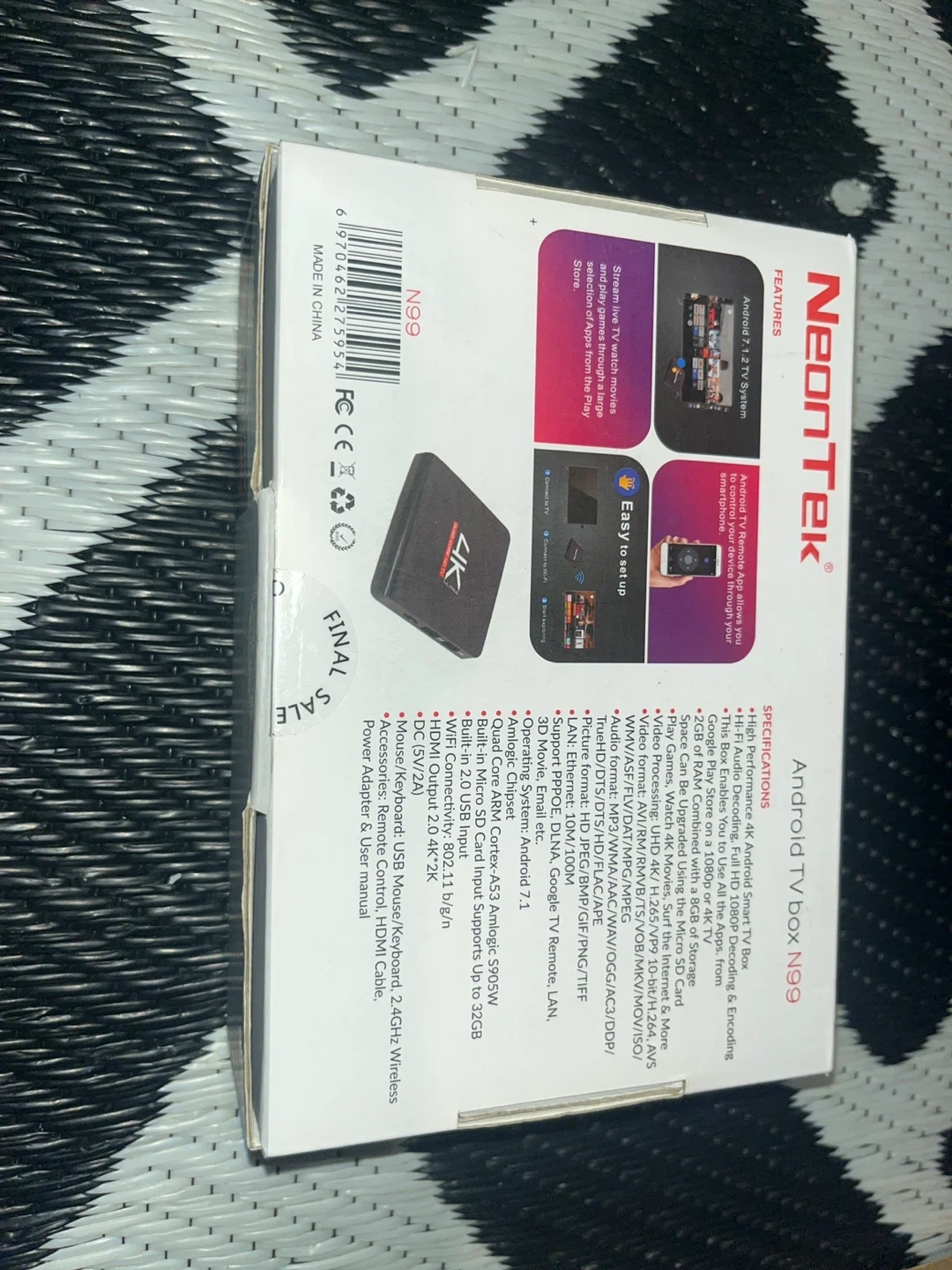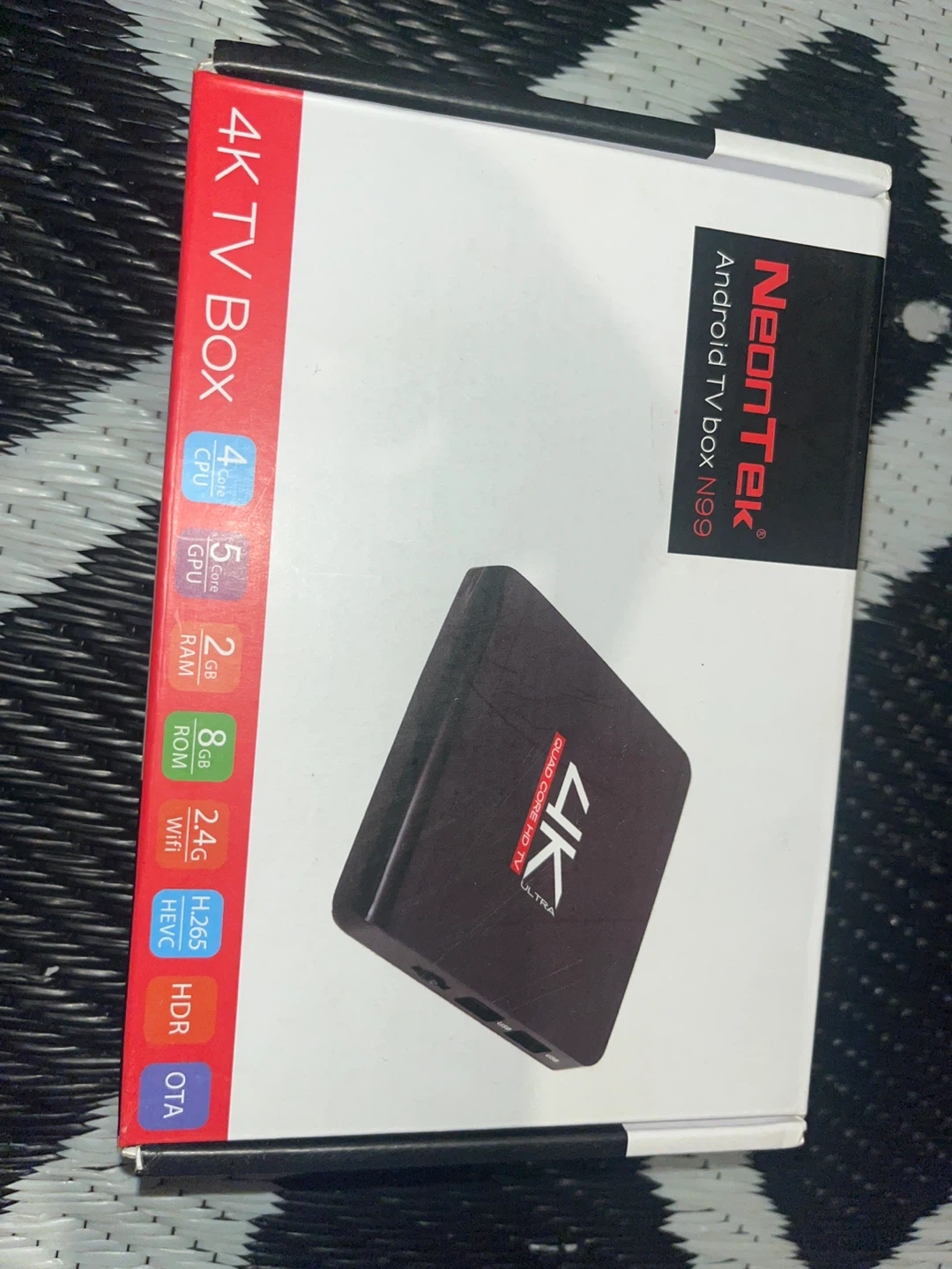 This NeonTek N99 Android TV box supports 4K streaming. It comes with 8GB RAM and 2.4G WiFi. The operating system is Android 7.1.