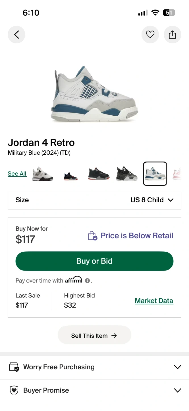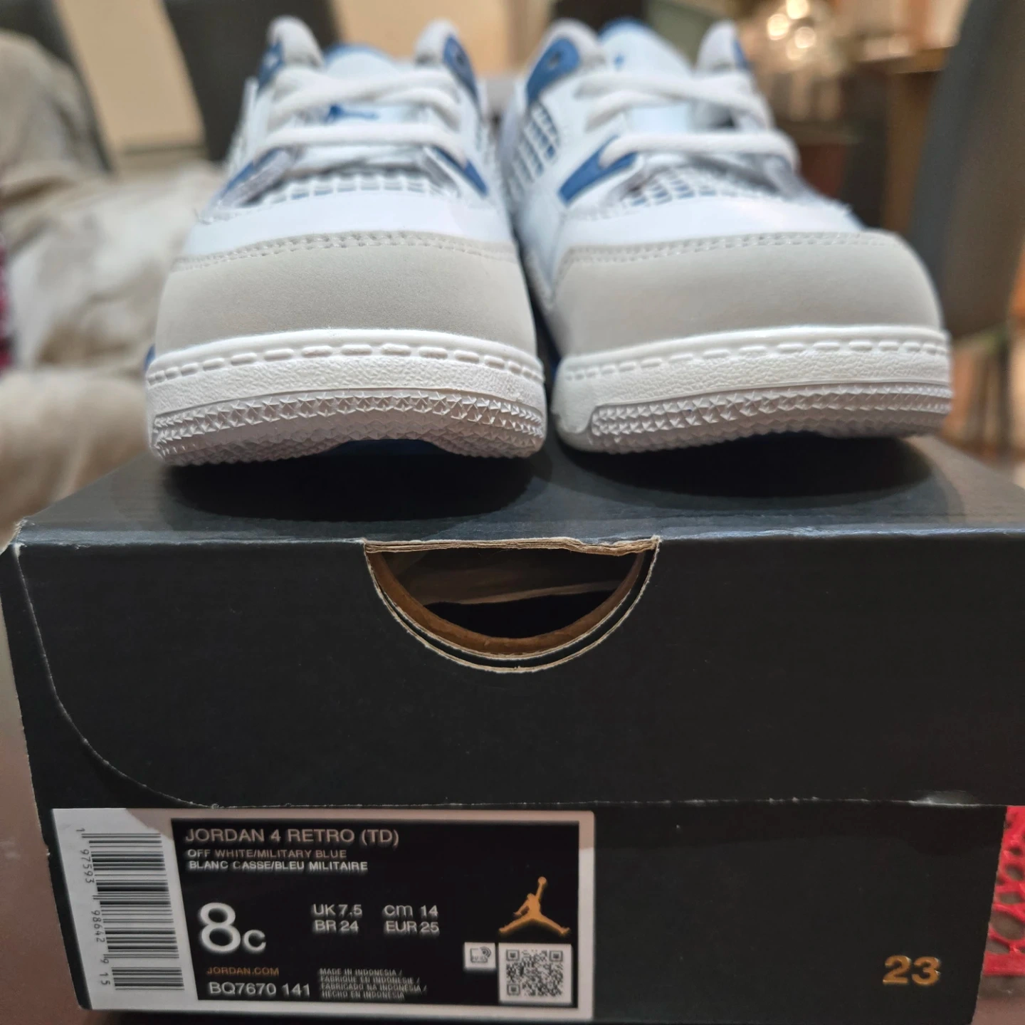 Selling a pair of Nike Jordan 4 Retro (TD) in size 8C. These are in excellent condition and come with the original box. The colour is Off White/Military Blue. A great pair of shoes for your little one!