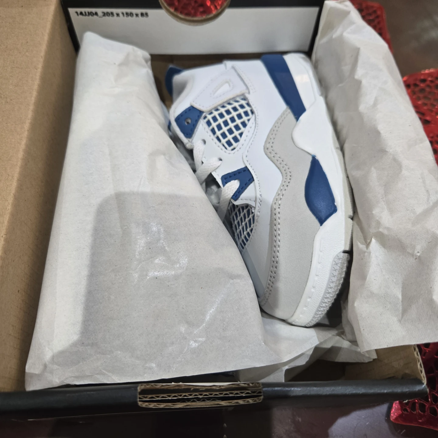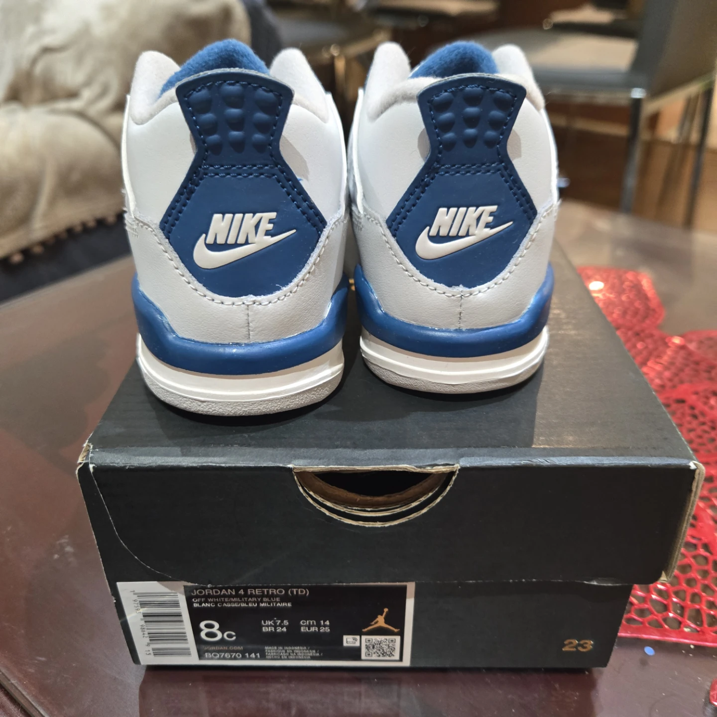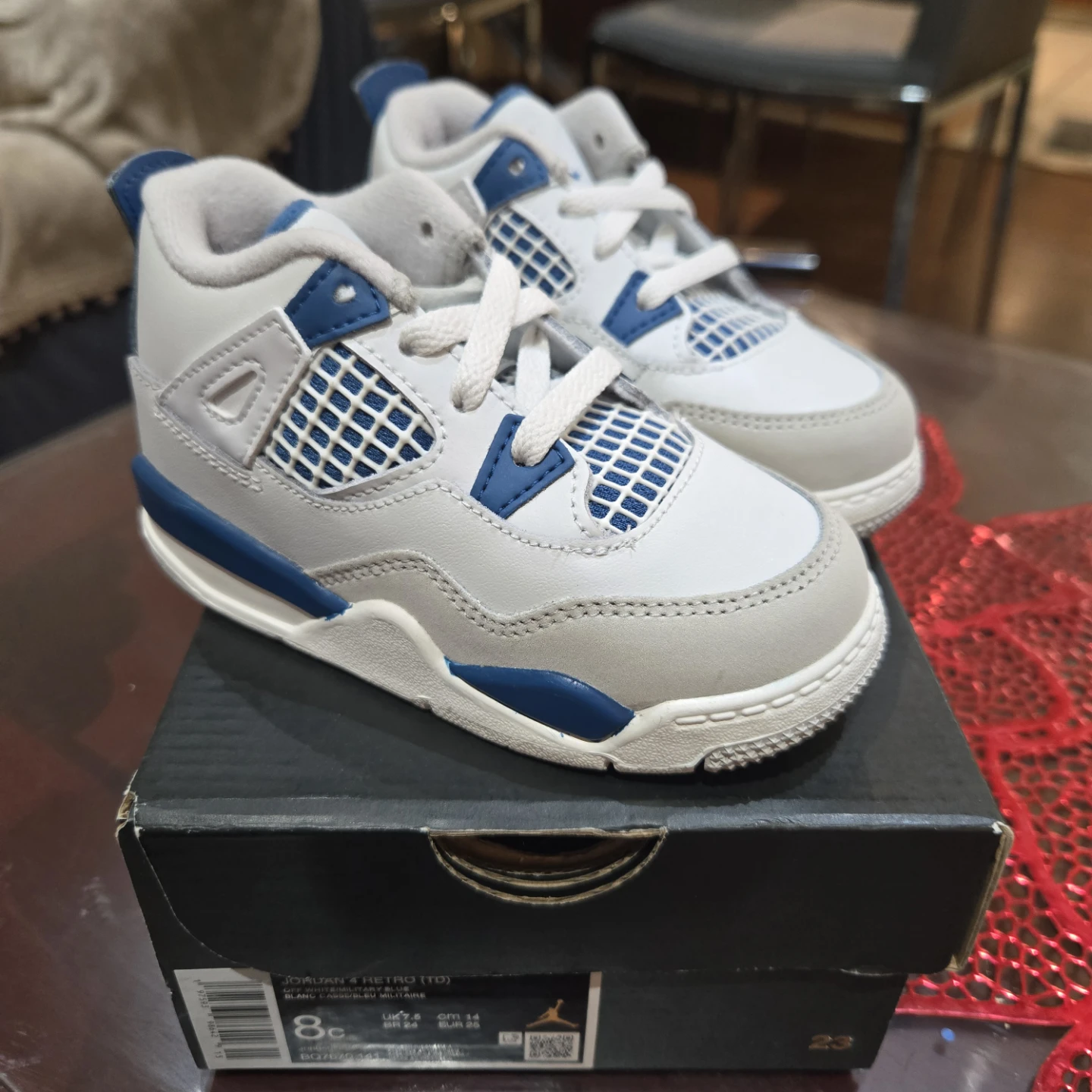 Selling a pair of Nike Jordan 4 Retro (TD) in size 8C. These are in excellent condition and come with the original box. The colour is Off White/Military Blue. A great pair of shoes for your little one!