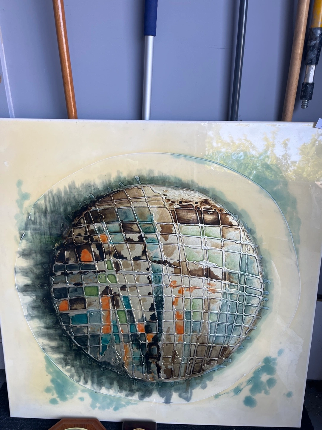 Vintage abstract art piece. Features a textured globe design. Cream coloured background. Large format. Unique style.