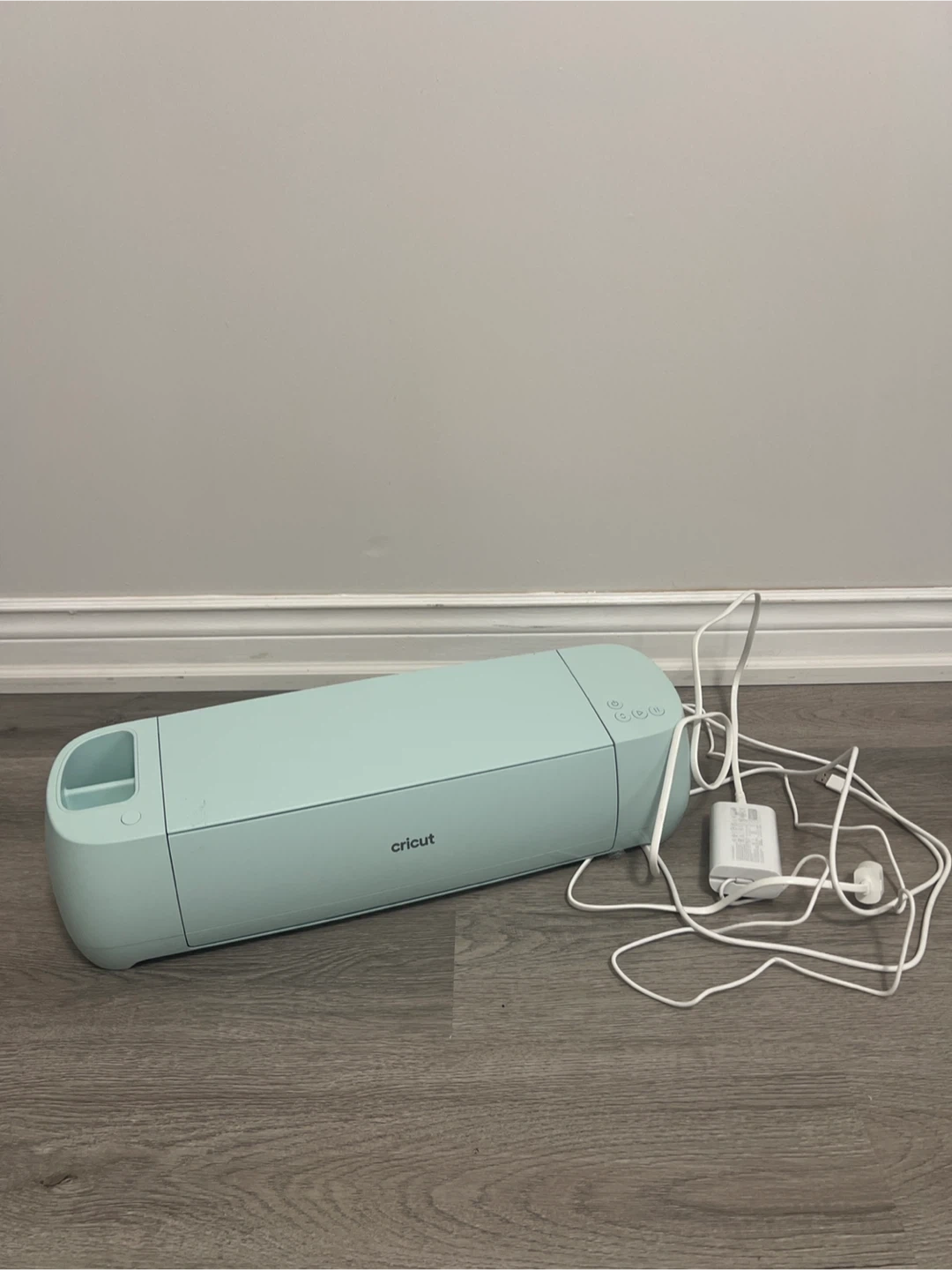 This is a Cricut cutting machine in a light blue colour. It comes with its power adapter. This machine is great for crafting and DIY projects.