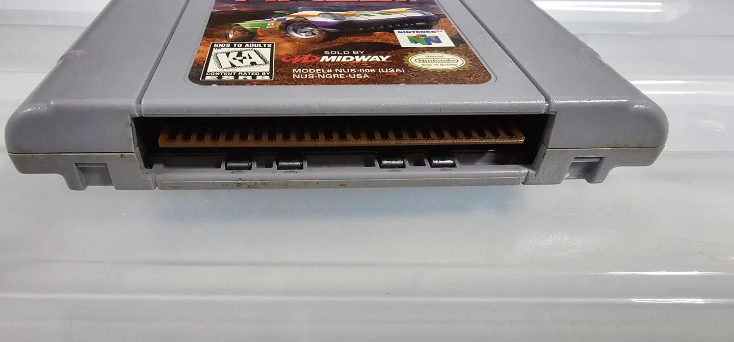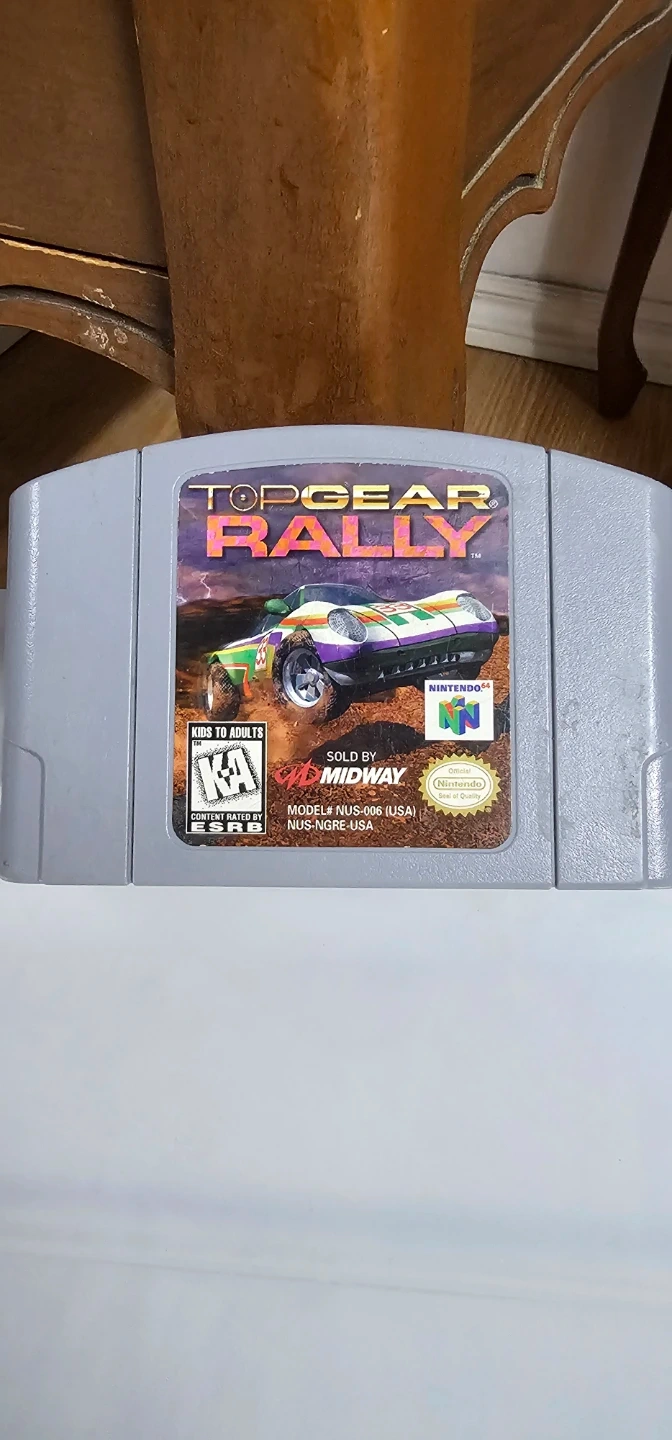 This is the Top Gear Rally game cartridge for the Nintendo 64. It's rated 'KIDS TO ADULTS' by the ESRB. Model number NUS-006 (USA).
