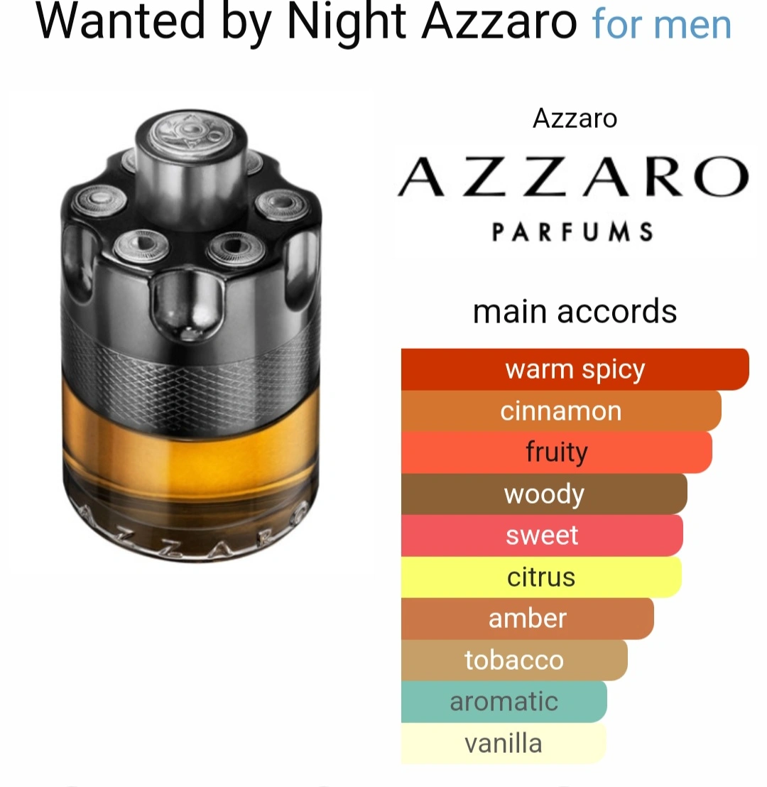 *Azzaro Wanted by Night is an explosive woody and spicy oriental of unabashed sensuality, a "blend of temptation and masculinity." The composition mixes exotic woods and spices, and highlights the three main accords: cinnamon, red cedar and tobacco.*