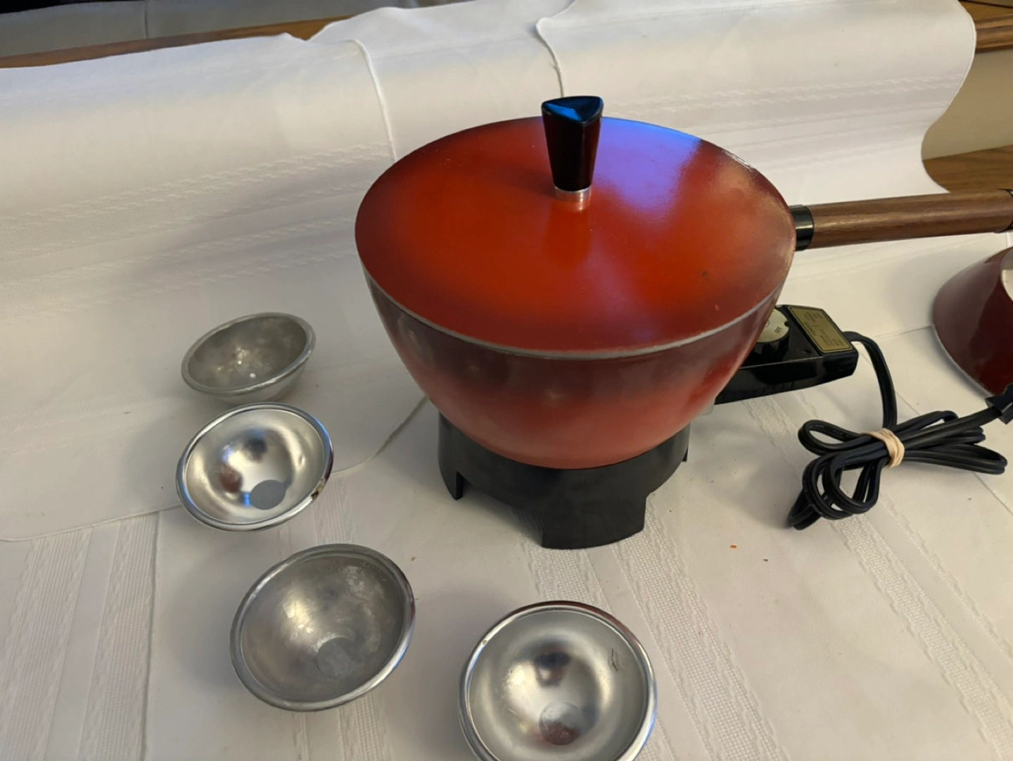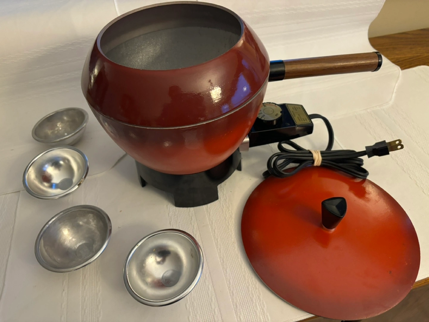 Red electric fondue set with four individual dipping bowls. Includes a lid and a wooden handle. The base has a temperature control.