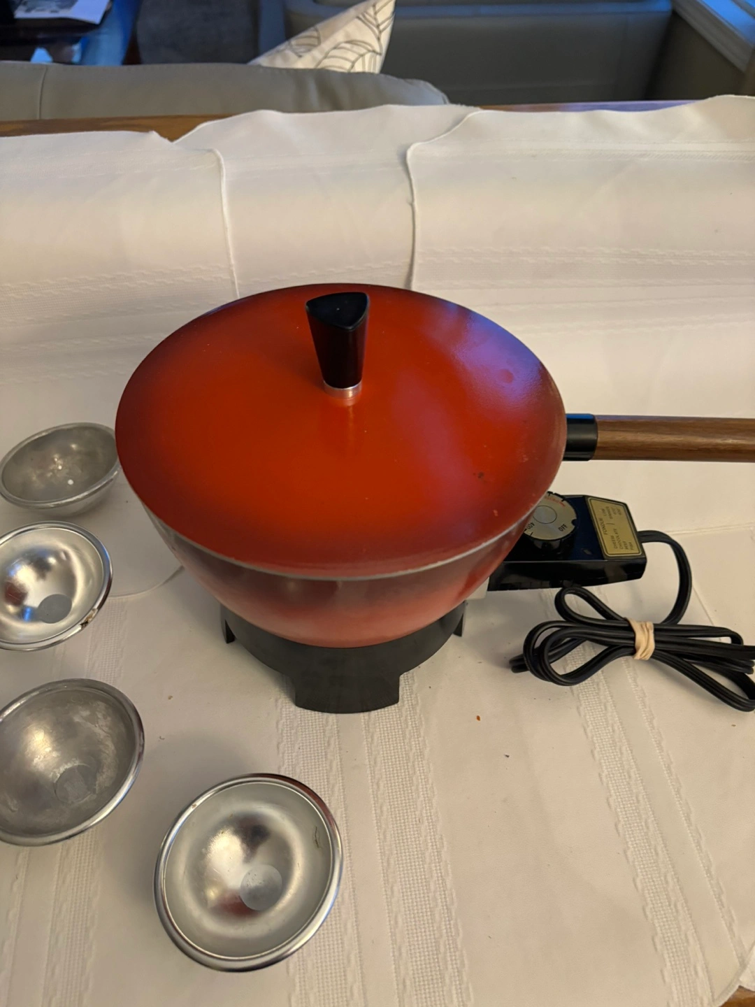 Red electric fondue set with four individual dipping bowls. Includes a lid and a wooden handle. The base has a temperature control.
