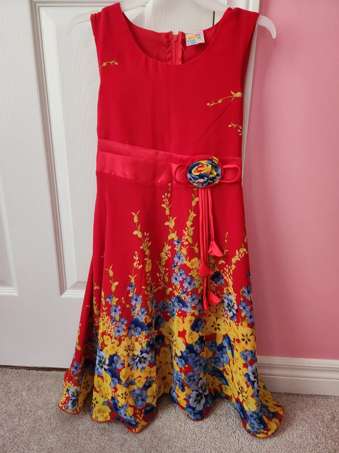 This is a cute red sleeveless dress for girls, size 10. It has a vibrant floral print with yellow and blue flowers along the hem. There's a satin sash around the waist with a decorative fabric flower and tassels. It's perfect for parties or special occasions!