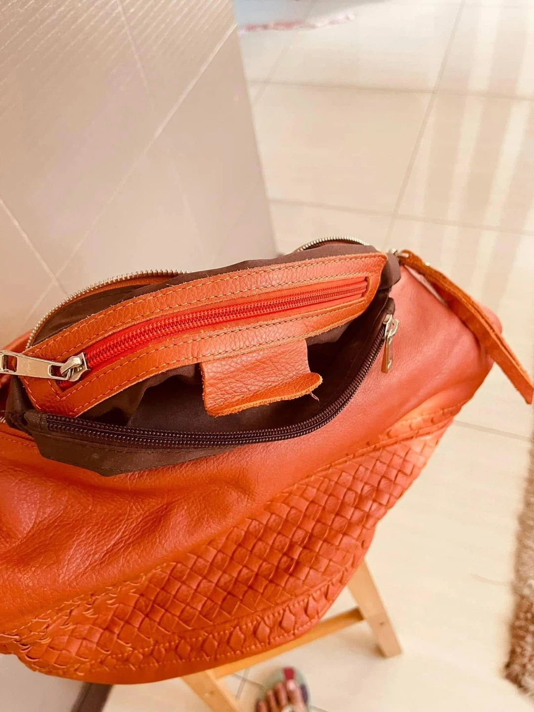 Stylish orange leather hobo bag with intricate woven detailing and silver-tone hardware. It features a zip-top closure and multiple interior pockets for organization. Perfect for everyday use!