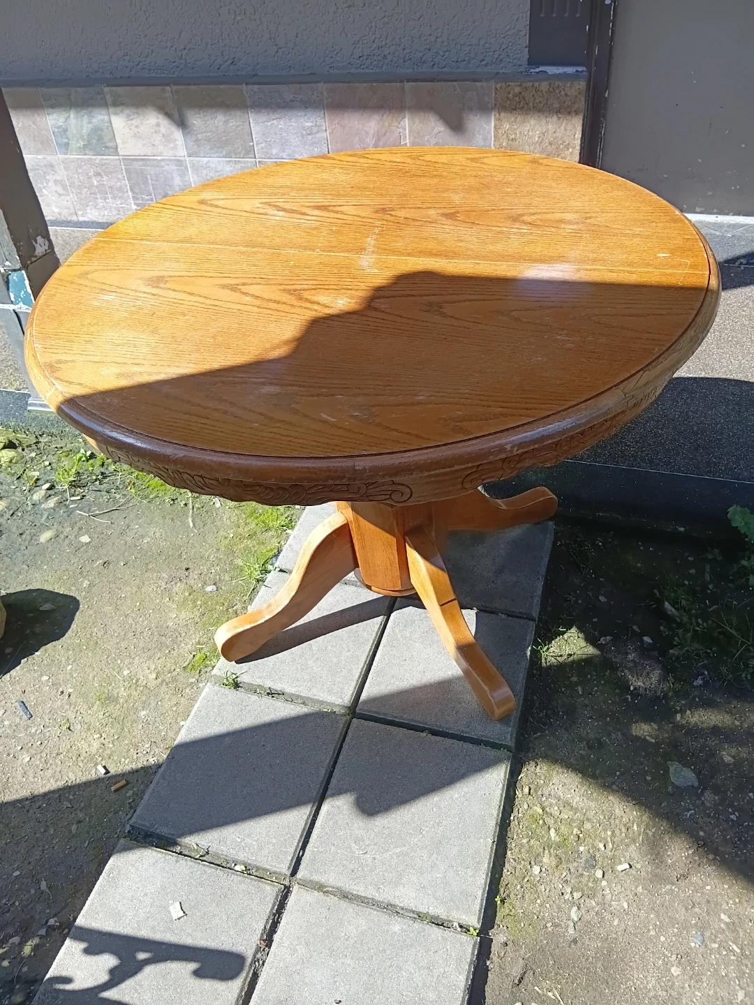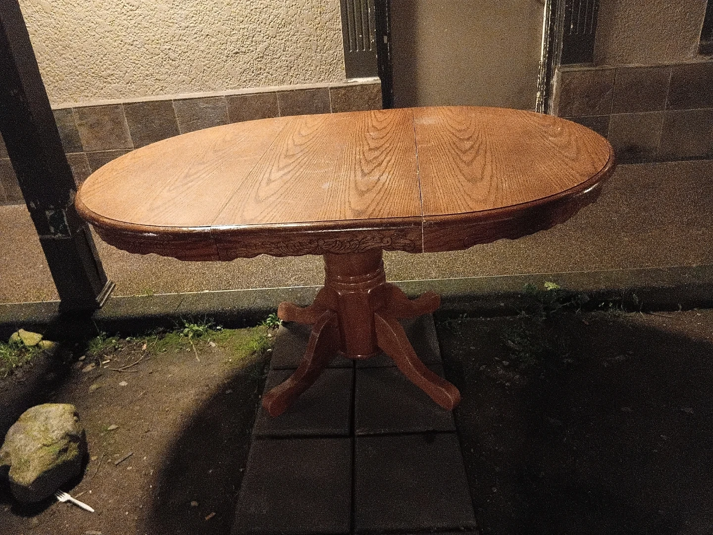 This is a solid wood dining table with a pedestal base. It features an oval-shaped tabletop with a decorative carved edge. The table has an extension leaf for added space. Minor wear is visible on the tabletop.