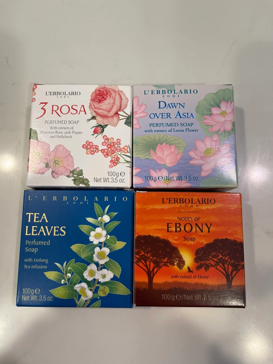 Famous Italian natural skincare brand. Set of four 100g perfumed soaps. Scented with: 3 Rosa, Dawn Over Asia, Tea Leaves, and Notes of Ebony. Made in Italy. Bought in Italy.