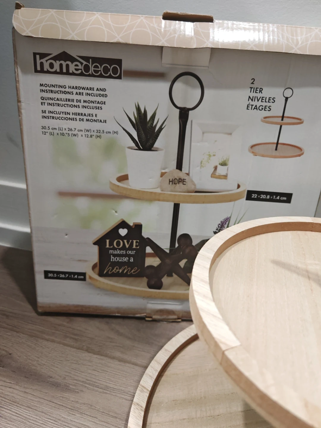 Two-tier Wood trays with a black metal centre pole and handle. Mounting hardware and instructions are included. 30.5 cm (L) x 26.7 cm (W) x 32.5 cm (H).