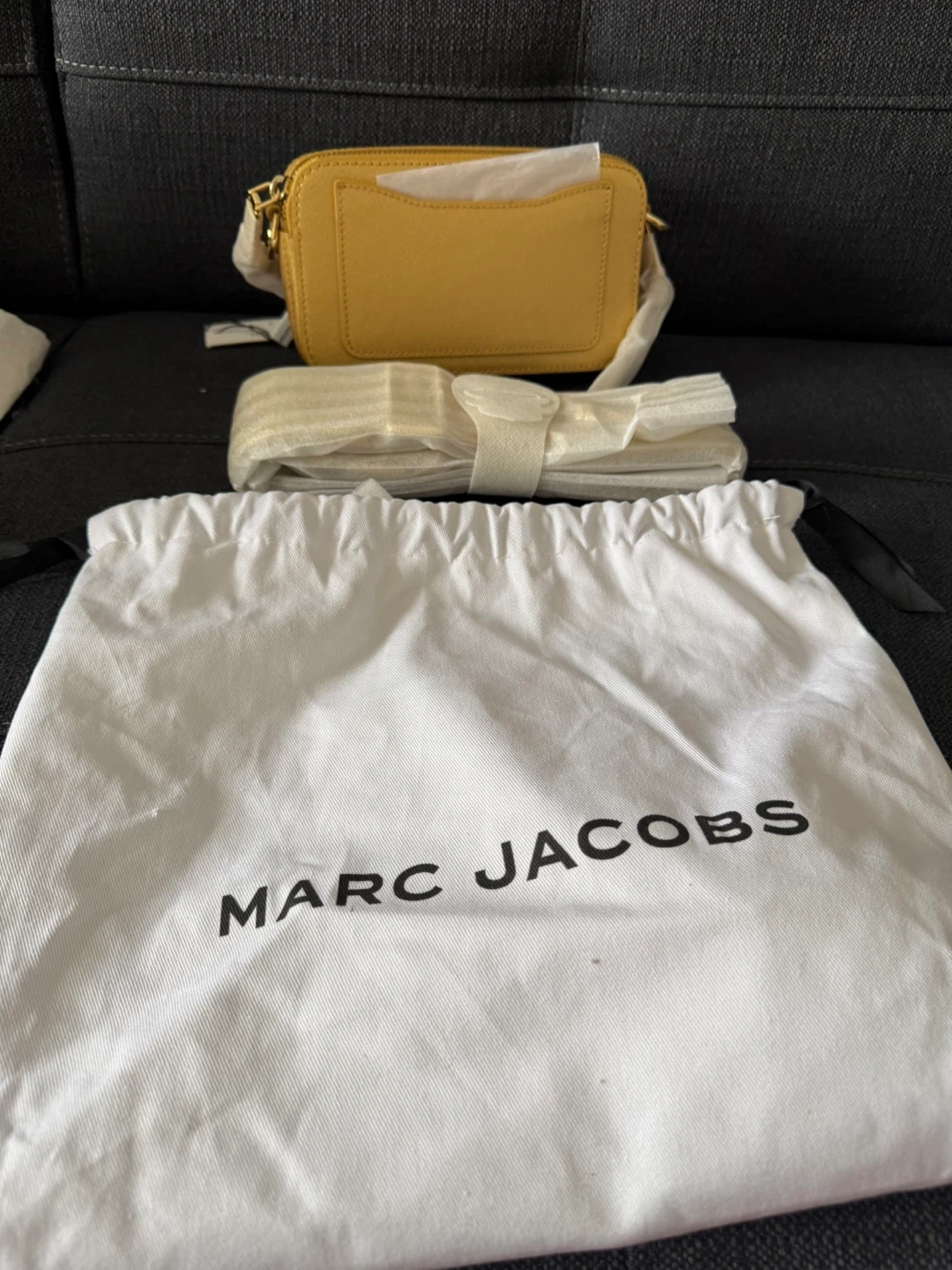 Marc Jacobs Snapshot camera bag in a lovely yellow colour. It's made of leather and comes with its dust bag and original packaging. This stylish bag is perfect for carrying your essentials on the go!