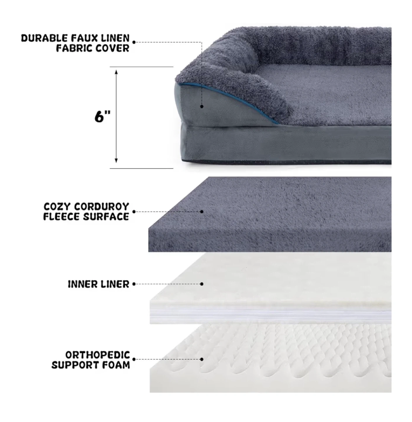 This large dog bed features a cozy corduroy fleece surface and orthopedic support foam. It has supportive bolstered walls for extra comfort and a non-slip bottom. The durable faux linen fabric cover has a hidden zipper design for easy cleaning. It's great for dogs up to 75 lbs.