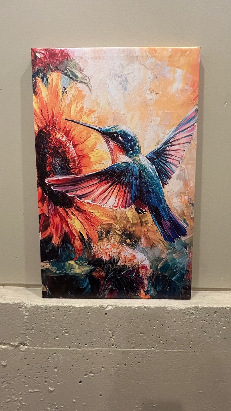 A lovely canvas print featuring a hummingbird and sunflowers. It would look great in any room!