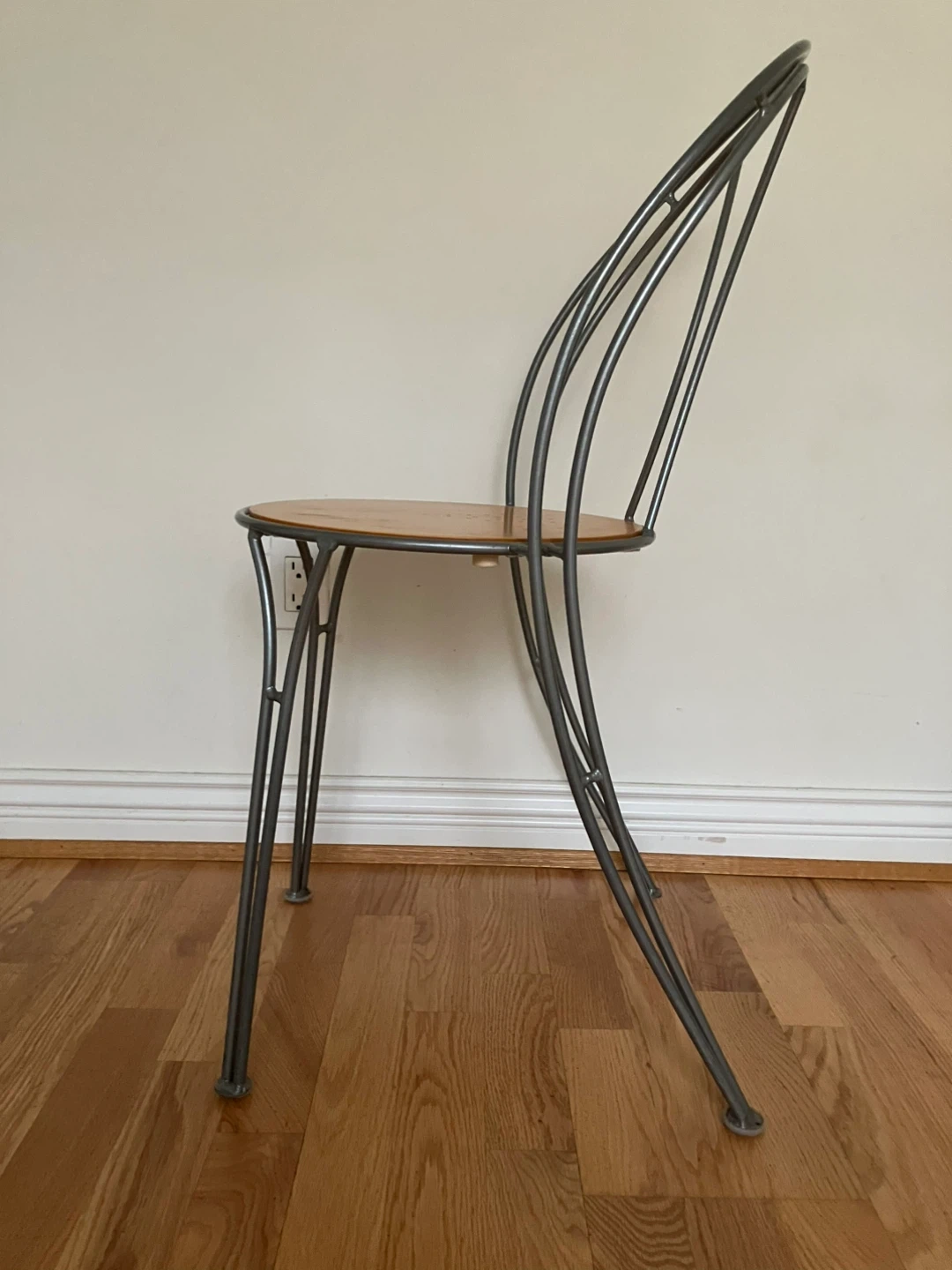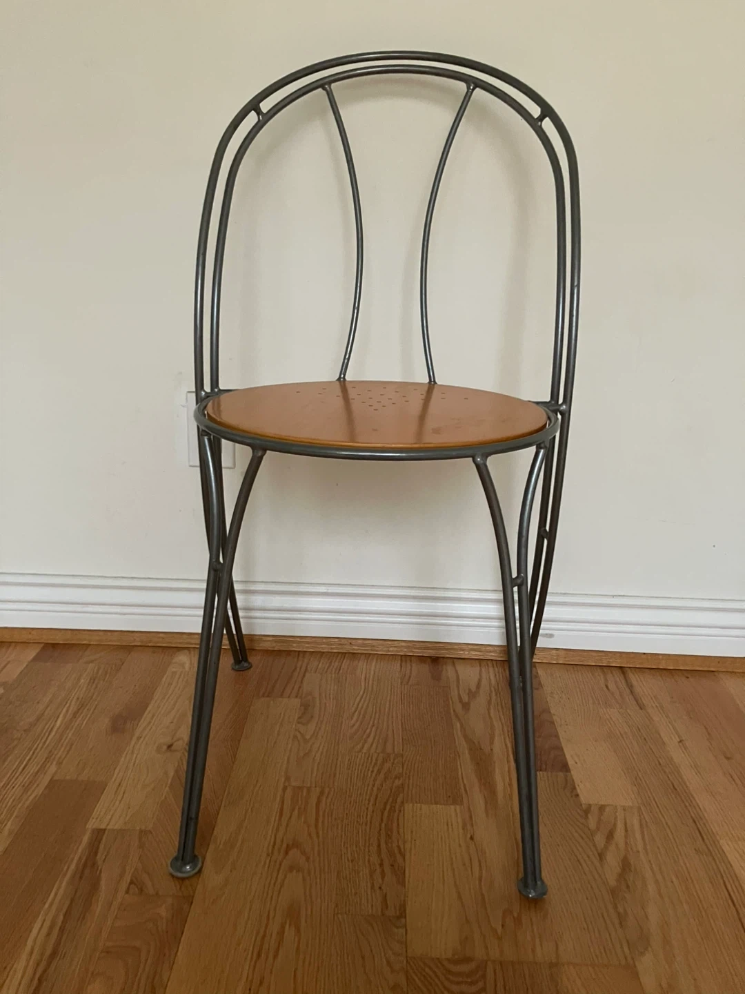 This bistro chair features a curved metal frame with a wooden seat. It's a stylish accent piece for any space. The seat is round and has small perforations.
