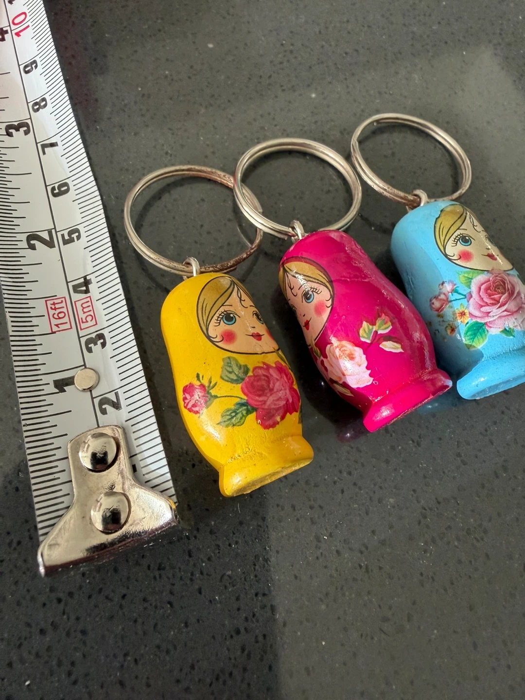 Set of three Matryoshka nesting doll keychains. Features brightly coloured painted dolls with floral accents. Each doll measures approximately 2 inches tall.