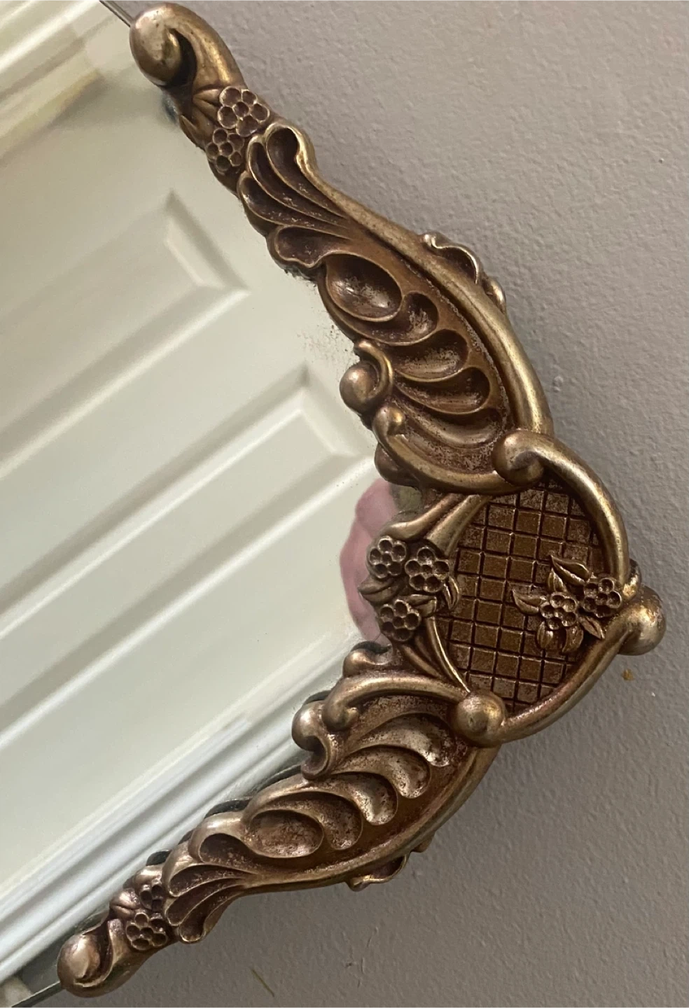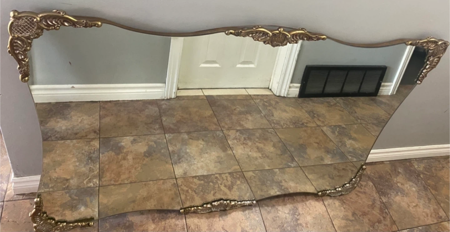This decorative wall mirror features a unique scalloped shape with ornate real silver trim with a layer of protective copper coating. Beveled glass, mid century from (1940s-70s). 50x32 inches.