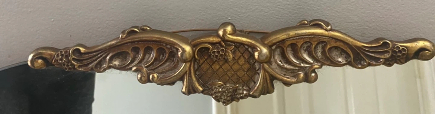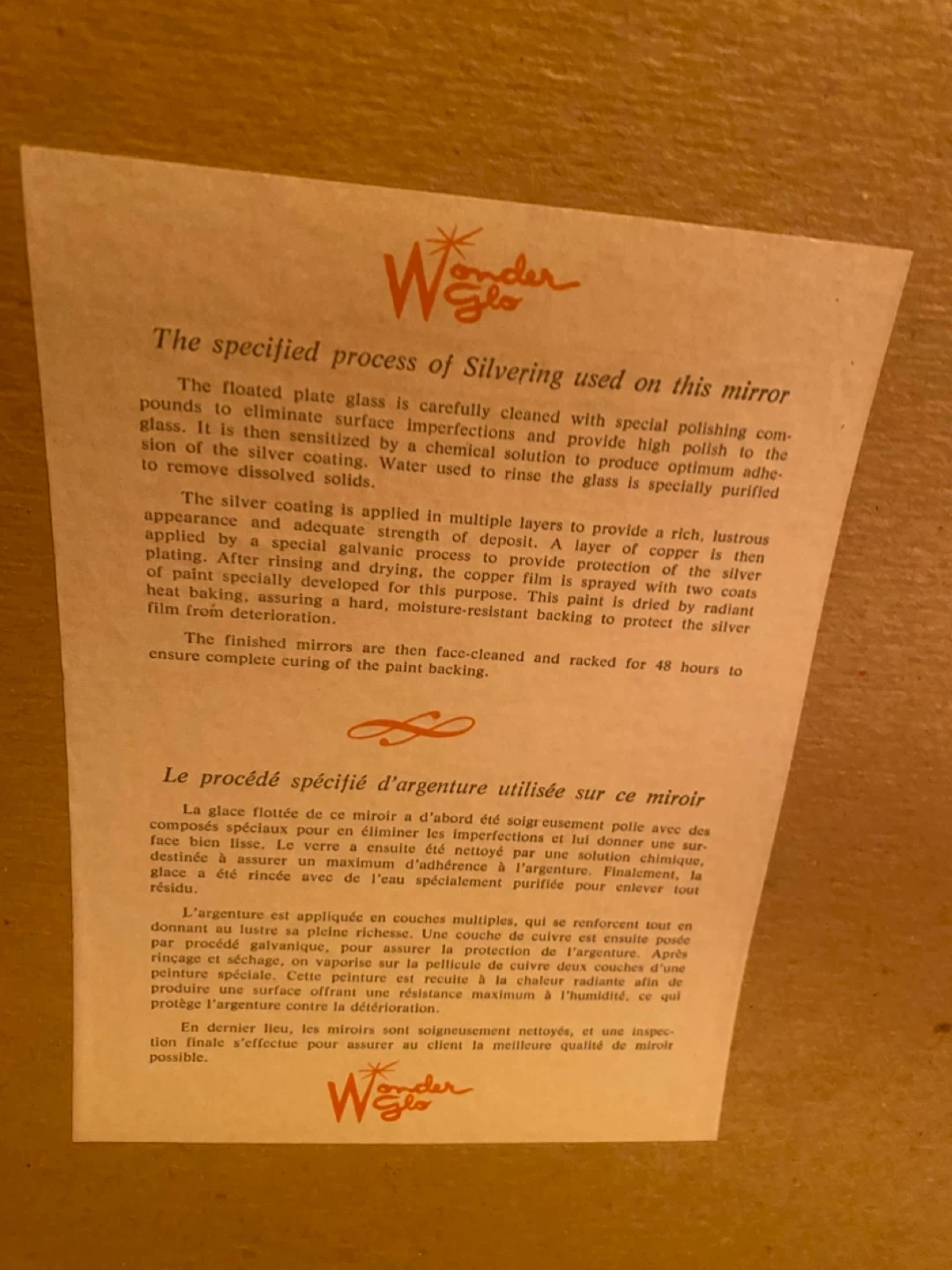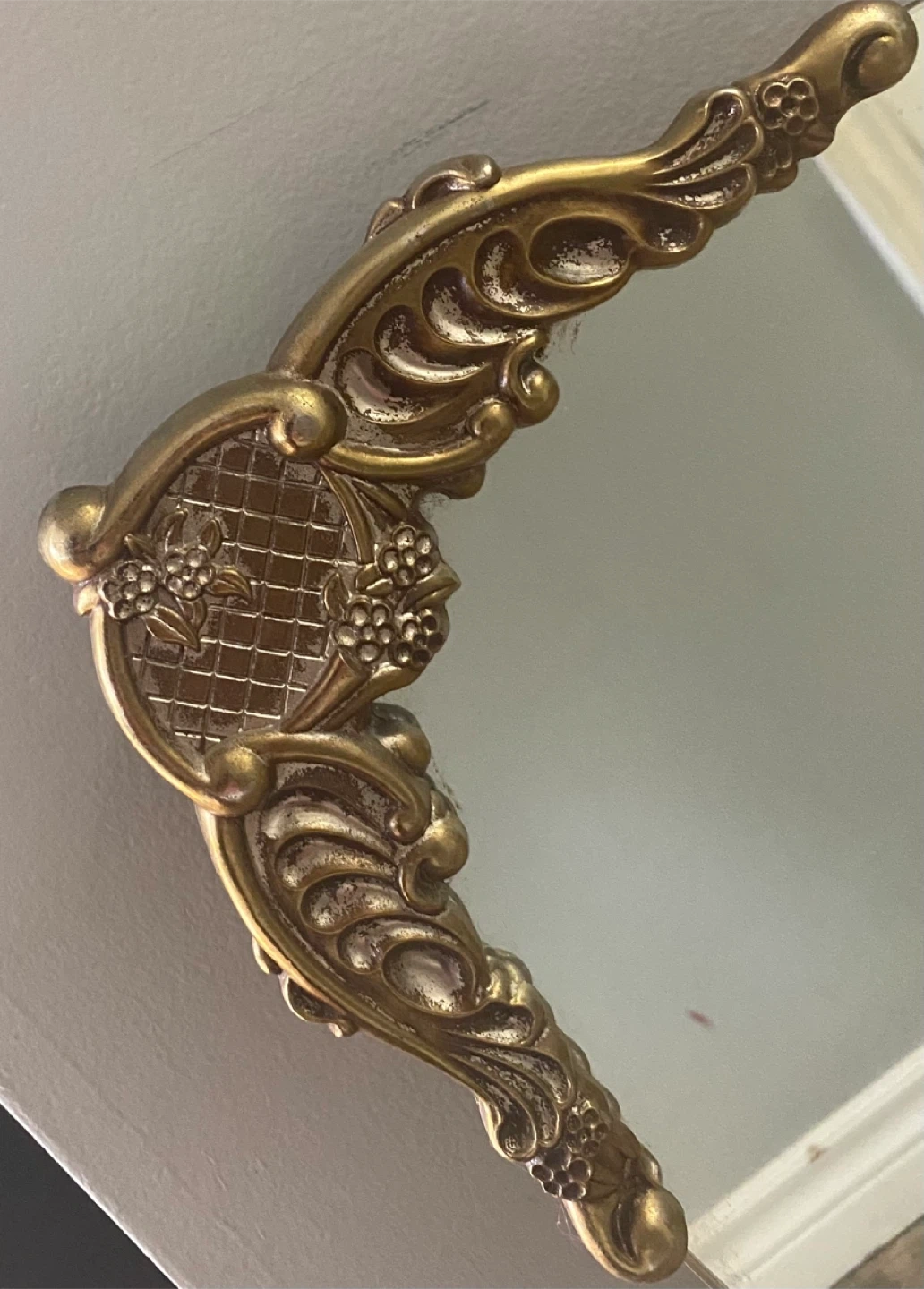 This decorative wall mirror features a unique scalloped shape with ornate real silver trim with a layer of protective copper coating. Beveled glass, mid century from (1940s-70s). 50x32 inches.