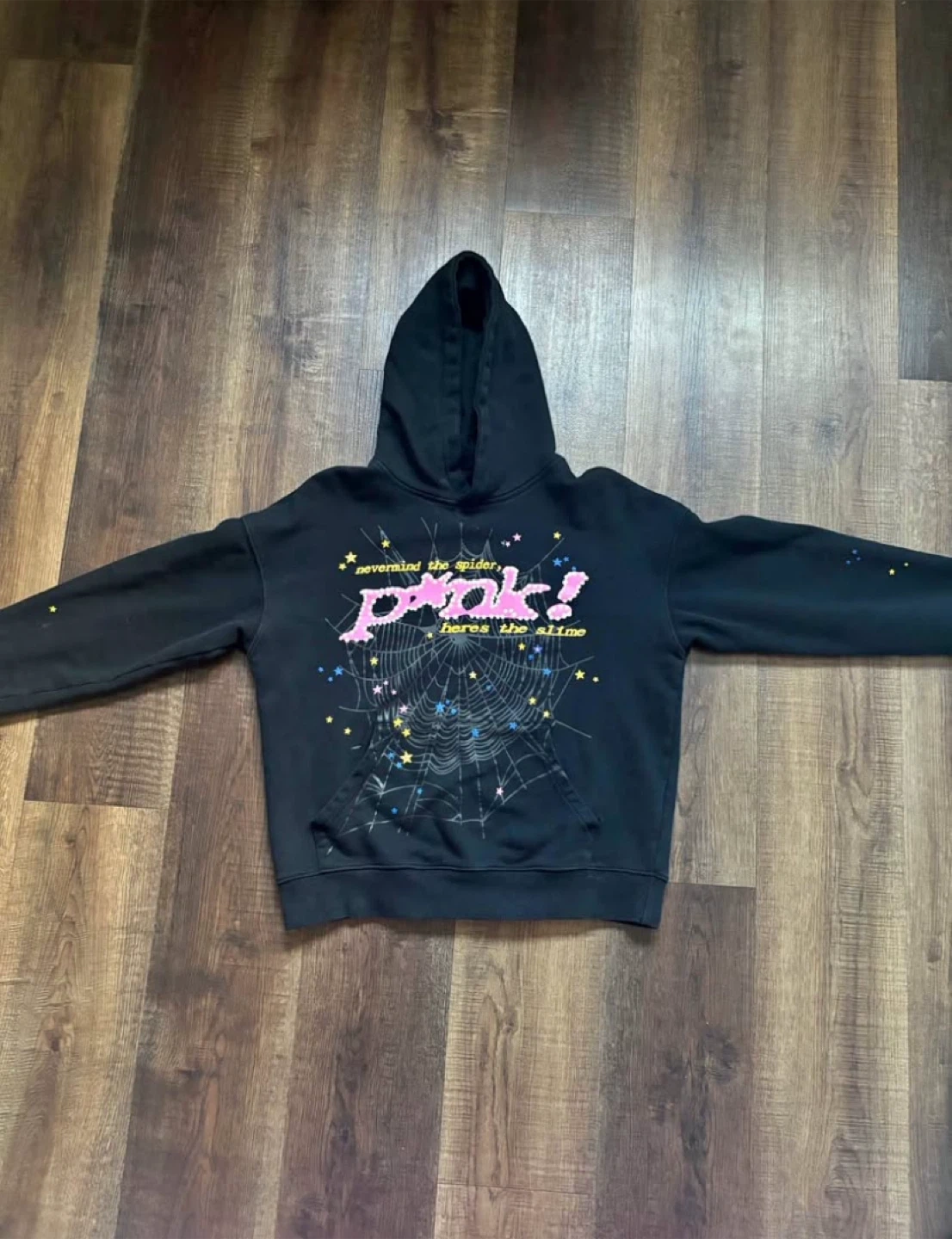 This black hoodie features the "pink! heres the slime" graphic with a spiderweb design. It's made of a comfortable cotton blend. Great for casual wear!