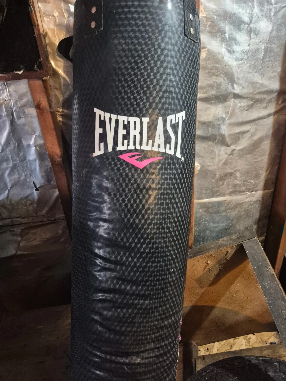 This is an Everlast punching bag with a textured black exterior. It's great for boxing and cardio workouts! It has reinforced hanging straps at the top.