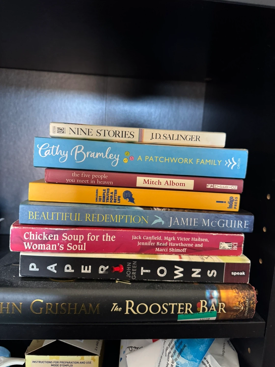 Collection of paperback novels including works by J.D. Salinger, Mitch Albom, John Green, and John Grisham. Also features 'Chicken Soup for the Woman's Soul'.