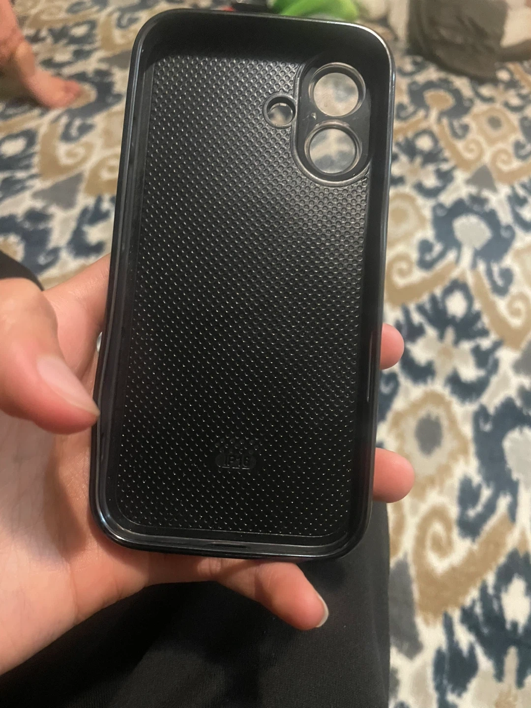 This is a black phone case. It has a textured interior. The case is designed for a specific phone model with cutouts for the camera.