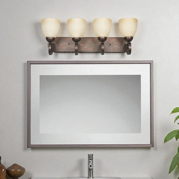Sunset Lighting Provano 4-Light fixture with Buttercup Glass, Teak Finish. Brand new in the box. Reversible, so it can be installed either way (upside down to picture). Suitable for Damp Locations. Uses 4 (100W) Medium Base Bulbs (Not Included). Teak with Buttercup Glass. 26-1/4”W x 9-1/4”H x 7-3/4”. Please see my other ads!